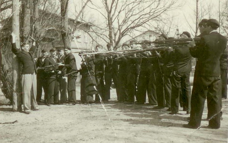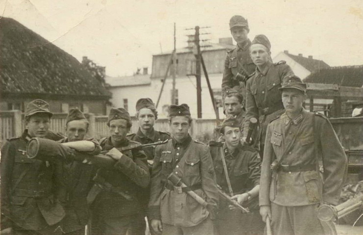 Võtame vaatluse alla kolm seltsimeest alumisest grupist! klo.jpg Vasakpoolne kannab vana tüübi politseipataljoni kuube, mille rinnale on õmmeldud WH kotkas ja peas WH pilotkat, vööl jälle viisnurgaga talupojarihm. Järgmine kuju on SS lõkmetega (mõõtudelt ebaproportsionaalsed) M-43 tüüpi vormikuuel, ...
