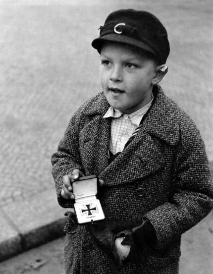Netist leitud foto , paistab et poiss püüab mõne liitlasvägede sõduriga toidu vastu vahetuskaupa teha .