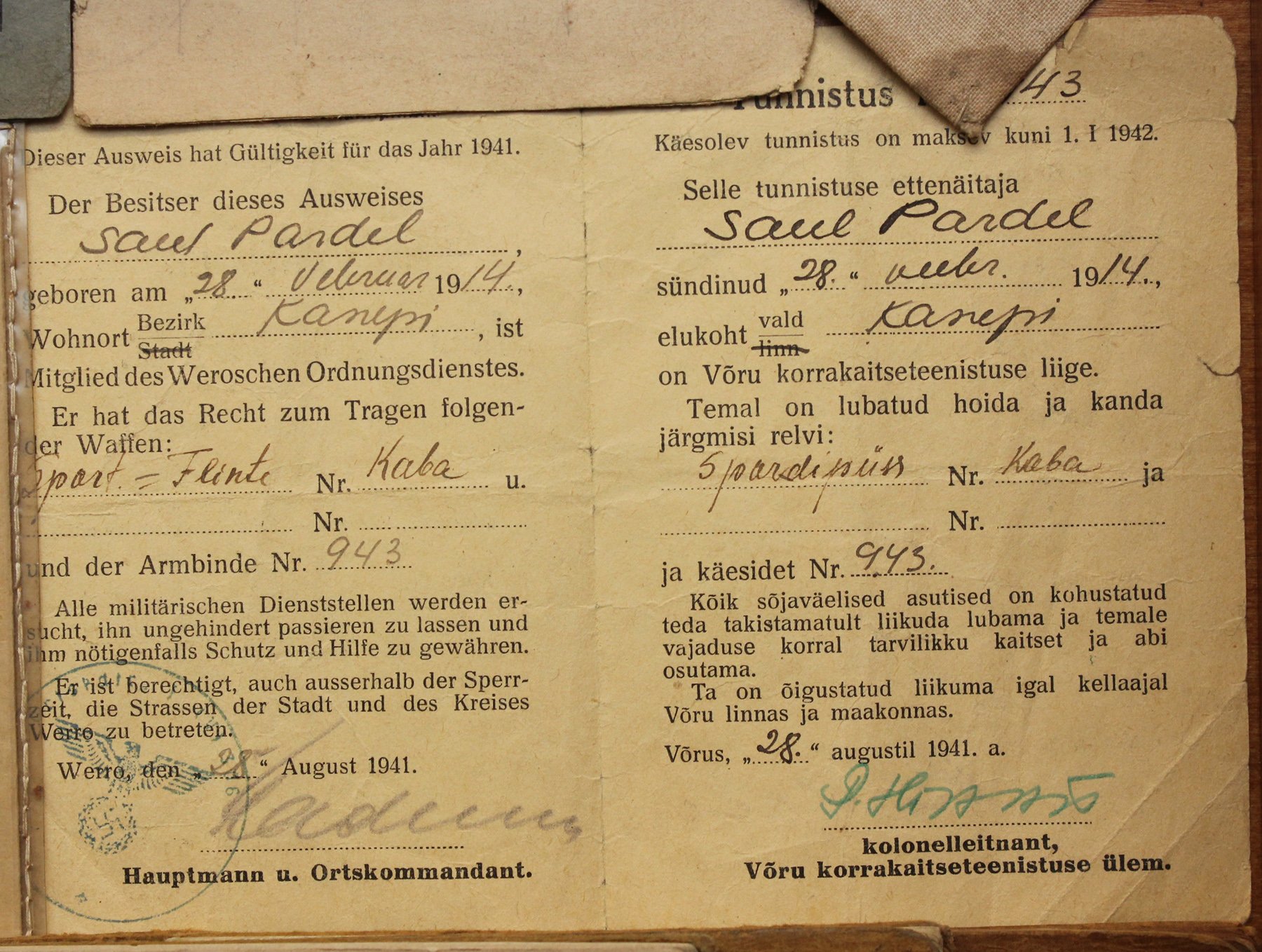 Võru korrakaitseteenistuse tunnistus 1941. aasta augustist (L. Tammiksaare kollektsioon).