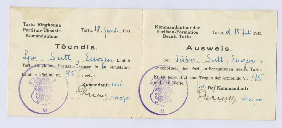 75 aastat tagasi, 1941. aasta juulis lipnik Eugen Sutt'ile välja kirjutatud tõendis selle kohta, et ta kuulub Tartu Ringkonna Partisan-Üksusesse ja on õigustatud kandma üksuse käiselinti.