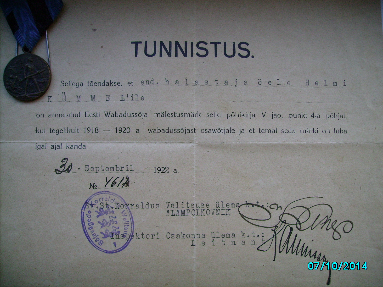 Teema alustuseks Soomusrongi divisjoni sanitaarrongi halastajaõe Helmi Kümmel (Kimmel) VS mälestusmedal.