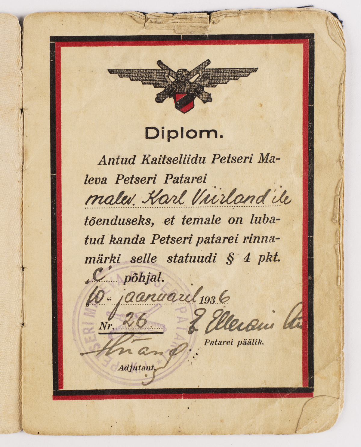 Eeskujulik pilt KL Petseri patarei rinnamärgist, Eesti Sõjamuuseumi kogudest.