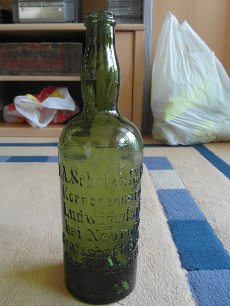 Selline ilus vana pudel,leitud pea võitlusliinilt.Pudeli peal järgmine jutt F.A. SCHOLZS SÖHNE KORNBRENNEREI. LUDWIGSDORF BEI NEURODE,CRAFSCHAFT GLATZ.GEGRÜNDET 1839. Huvitav millist märjukest see kunagi sisaldas?