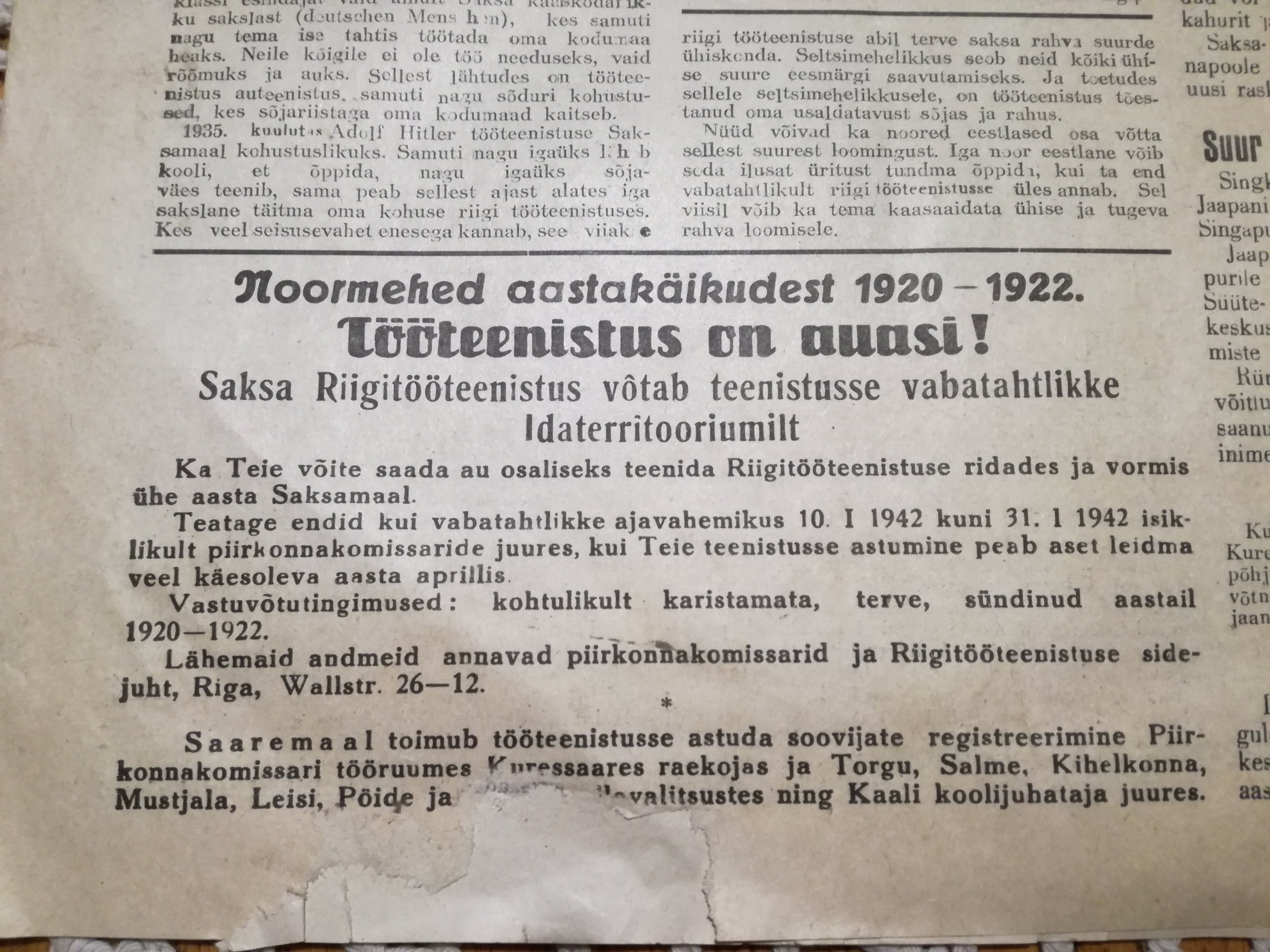 Jah, armeeteenistuse reklaamimise kõrval käis ka usin Tööteenistusse kutsumise propaganda ja poisid läksid ka. Minu onu Leopold läks ilmselt sama kampaania käigus mida antud ajaleheartikkel kajastas. Ajendiks sai regulaarne valla poolt esitatud küttepuude varumise/valmistamise nõue millest sai peagi kõrini. Märtsis läks Rakverest Virumaa meestega rongiešelon ca 180 mehega teele, Tapal ühines umbes sama palju vaguneid Tallinna, Lääne-Eesti ja Saaremaa meestega (Lõuna- ja Kesk-Eesti omi ei olevat olnud), sõideti Poola Ratzki väljaõppe laagrisse. Sealt mai alguses 1942 saadeti edasi Põhj-Saksamaale Wesermünde linna lennuvälja laiendustöödele.