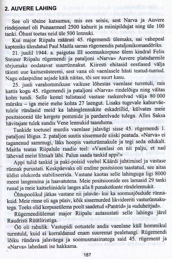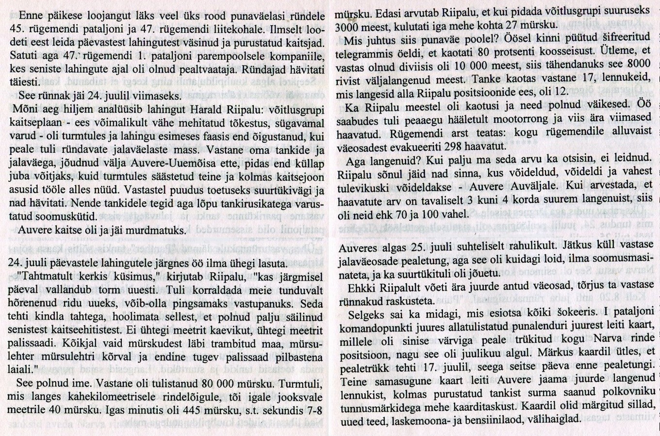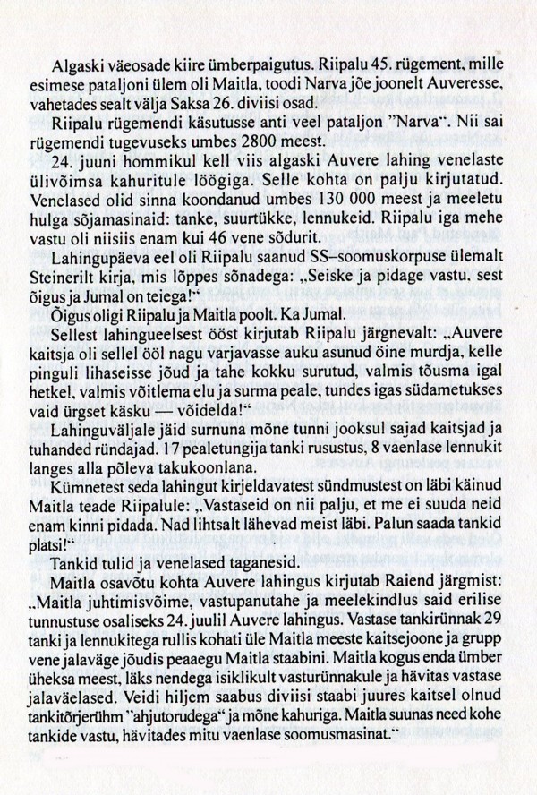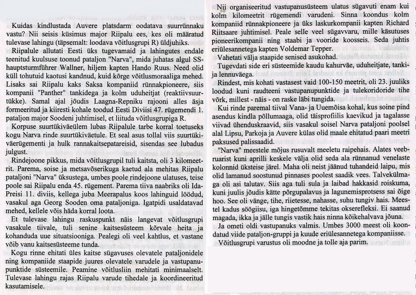 Mäletan, et sel ööl ma uinuda ei saanud - olukord oli liiga ärev. Mõtlesin meie kompanii poistele: “Kas nad suudavad vastu pidada?” Vastase poolel oli suur ülekaal nii elavjõu kui ka tankide osas. Kui major Riipalule alluvates üksustes oli umbes 2000, kõige rohkem 2500 meest, siis vastane võis meid rünnata mitme diviisiga. Oli ju Punaarmee rünnaku eesmärgiks Auvere juures rindest läbi murda, jõuda mereni Mummasaares ja armeegrupp “Narva” kotti võtta.