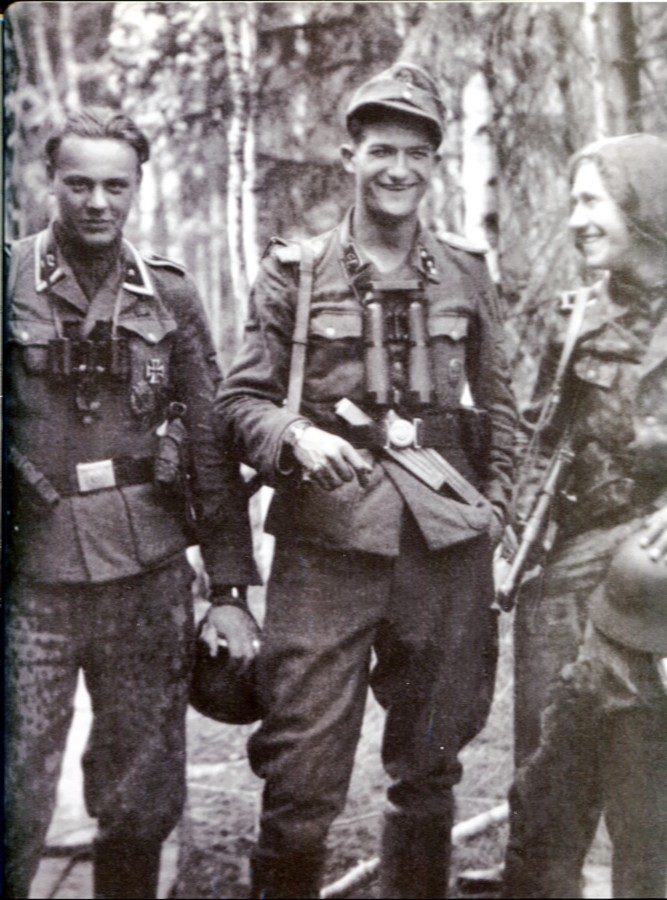 Läksime ltn H. Niidrega diviisi ülema Augsbergeri (kindralmajor Franz Augsberger — toim) juurde teatega, et oleme kohale jõudnud ja ootame meile määratud ülesannet. Meid nähes oli tal väga hea meel. Minule pilku heites ütles ta, et me oleme juba varem kohtunud, mis oli õige. Ta mäletas mind Debica õppelaagrist, kui olime allohvitseride kursuse lõppmanöövritel, kasutades elavat laskemoona. Tema, ja tundus, et pool „Saksa riigi juhtkonda” koos Himmleriga olid otse meie selja taga, kui ma Truppenführerina juhtisin kahe raskekuulipilduja tuld nii, et põld eemal tolmas. Sinna seadsime enne manöövrite algust kulissid üles, mida püüdsime nüüd purustada. Neid tegelasi ma algul ei näinud, kuid silmanurgast taipasin äkki, et meil on palju läikivate nahksäärikutega pealtvaatajaid, kellel õlad kuppusid täis. Püüdsin siis anda oma parima, kasutades looduse poolt sündides kaasa saadud näitlejavõimeid, et meie tegevusest head muljet jätta.
