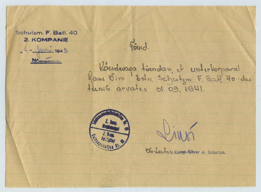Nimekirjas on keegi Hans Õim, kes on teeninud Saksa relvajõududes juba 1941. aasta sügisest nagu on kirjas lisatud dokumendil.