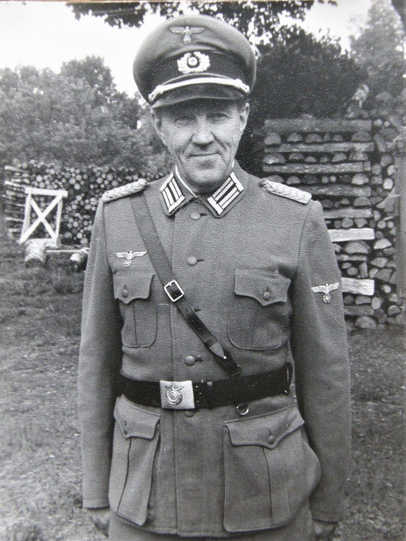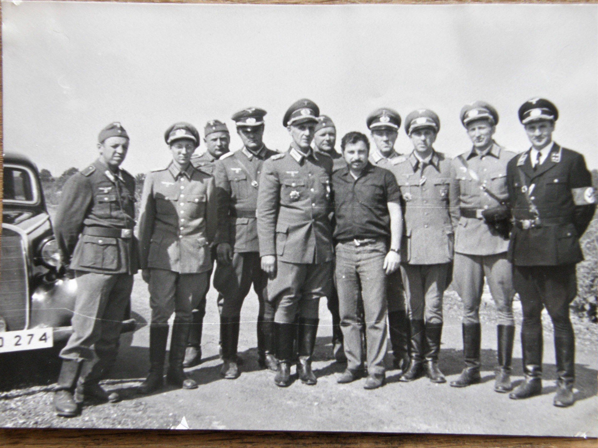 Tere. Antud fotodel pole tegu tegelikult olnud vormidega, sest on näha väga palju erinevusi õigetest vormidest. Üksikul fotol paistab olevat majori auastmes Wehrmachti ohvitseriga. Kuid miks on tal käisel kull, nagu SS väeosadel? Ja miks kannab ta alamväelaste rihma, millele on lisatud imelikult veel portupeerihm. Ka kannab ta peas mingit lätut, mille märgid pole isegi seatud kohakuti. Sakslaste korrektsuse juures on see tavatu. Samuti on erinevatel fotodel tal erinevalt aumärke. Kõik see näitab,et tegemist on mingi filmi seltskonnaga.