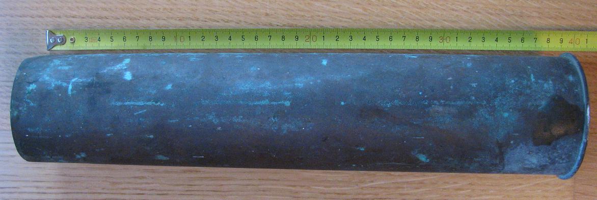 30ndatel ehitatud aida pööningult leidsin sellise vene päritolu vasest suurtükihülsi. Ja jällegi ei tea nendest midagi... kas sõjaaegne? Aastaarvu ei leidnud (võibolla saastakihi all), pikkus ca. 40 cm. ja diameeter ca. 8cm.