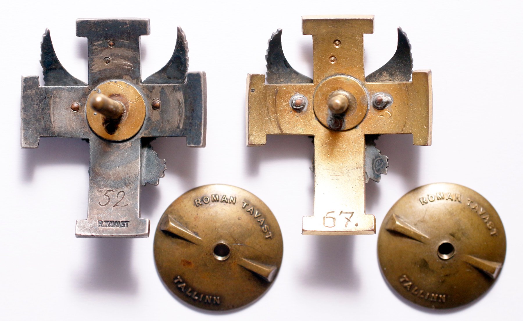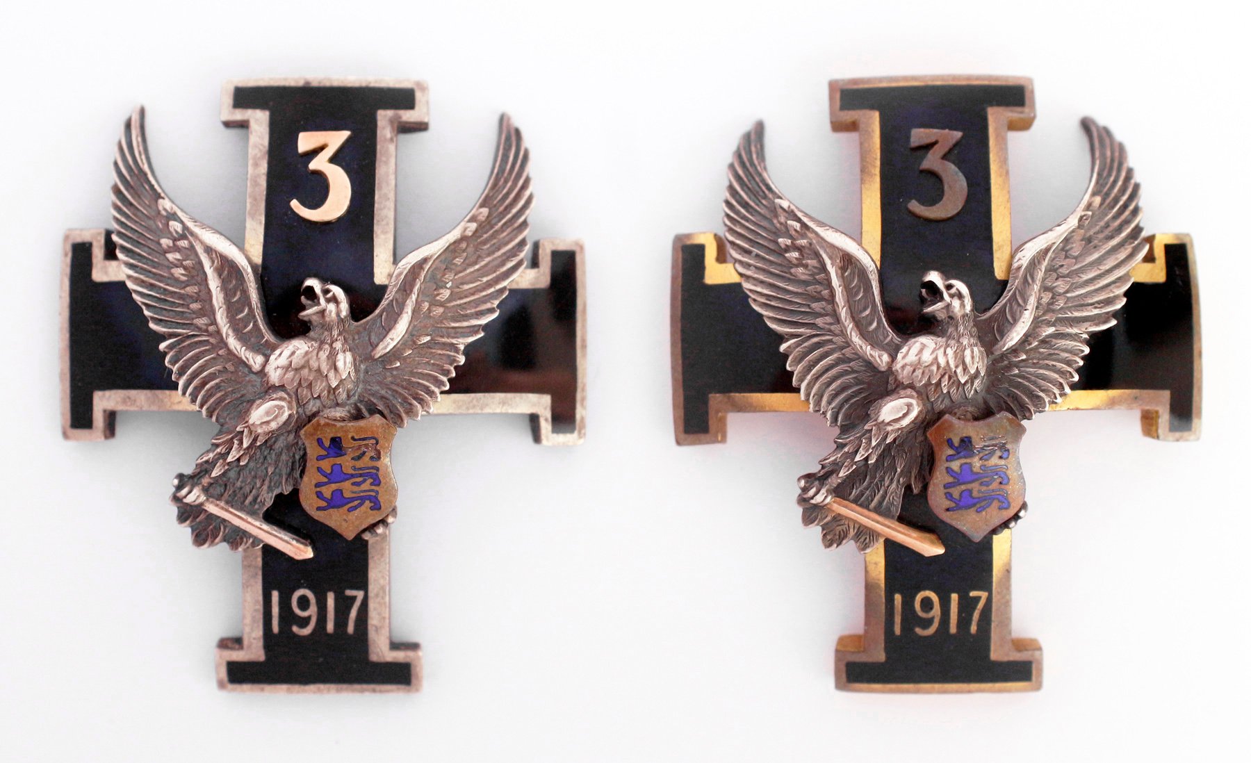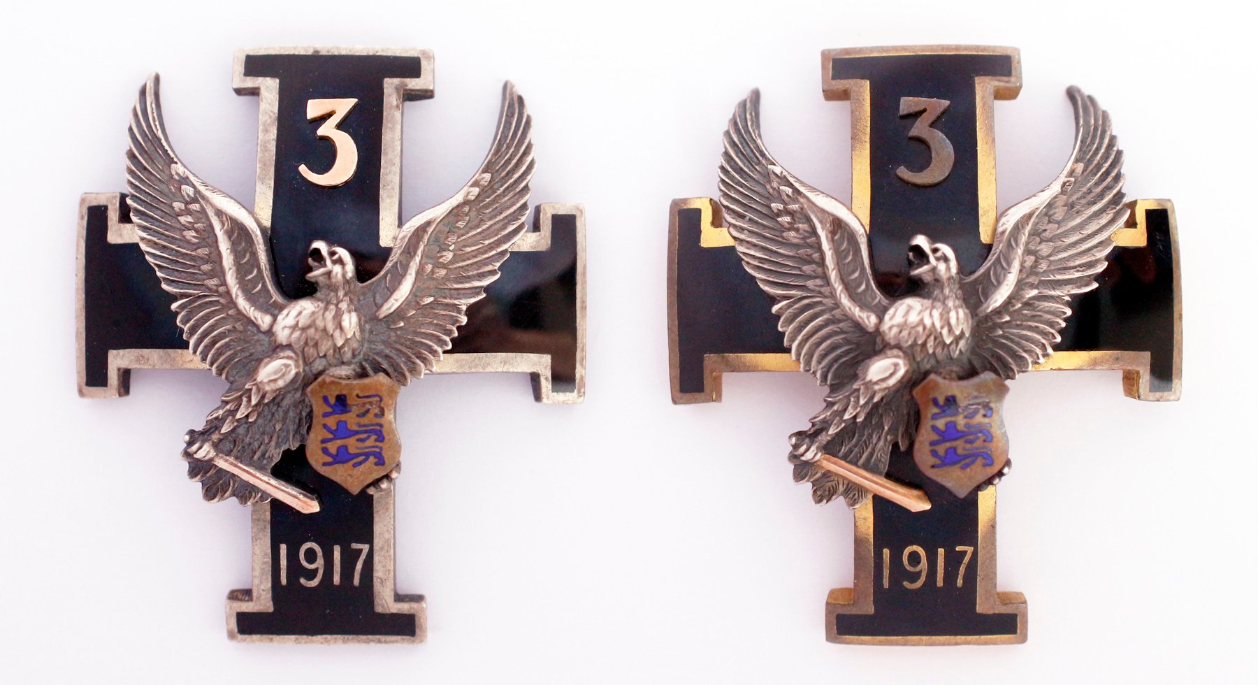 Vasakpoolsel märgil serv hõbedane, number 3 kullast või kullaga plakeeritud ja alumise haru tagumisele küljele sisse pressitud Tavasti kiri. Parempoolsel märgil serv ja kotka küüniste vahel oleva mõõga tera on kullatud, number kolm on olnud vist kullatud ja see on tänaseks päevaks tuhmistunud / kulunud. Parempoolne märk on ka natuke paksem ja kumeram kui on vasakpoolne.