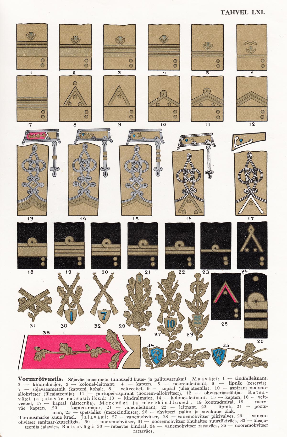 Parempoolset on Ben selle teema alguses näidanud ja juurde lisanud, et 1926. aasta vormilt - vaatasin 1924, 1926 ja 1936 aasta vormikirjeldused läbi ja sellist ei jäänud kuskil silma. Küll aga olen sellist kraemärki näinud fotodel, kus see on 1936. aasta lõikega vormikuue krael. Millise vormi juurde see siis ikkagi kuulus - 1926 või 1936? Ning lõpuks see keskmine propeller & tiivad - kas see on 1936. aasta üleajateenija oma? Kas selle viimasega käivad koos tähed "L" ja "B" või käivad need tähed selle pildil parempoolse kraemärgi juurde?
