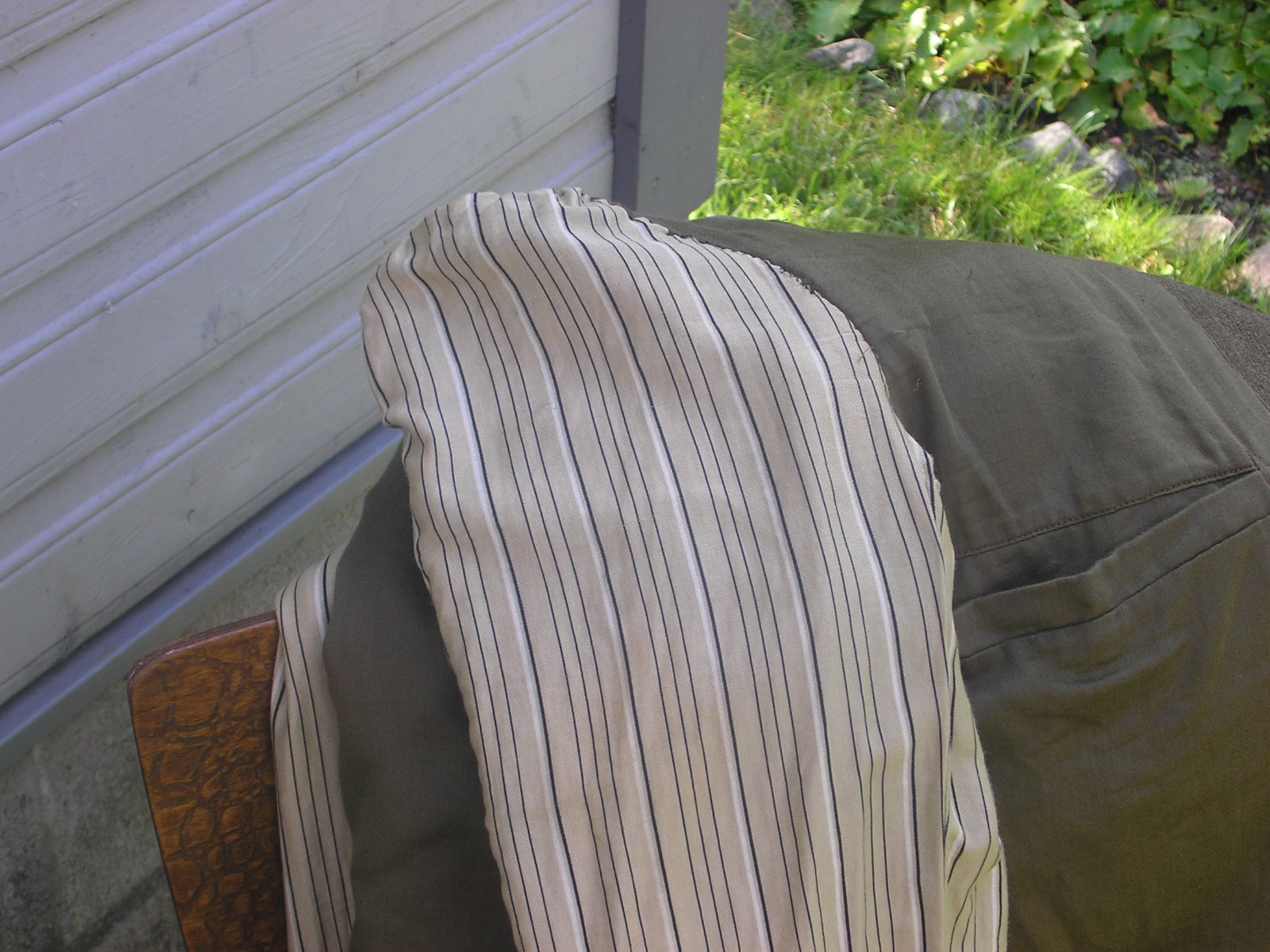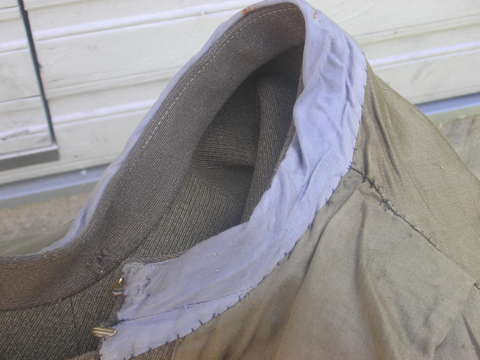 Siiski,hea valguse käes vaadates on pleekimise jäljed olemas. Paguni kohad on ka teistvärvi niidiga uuesti kokku õmmeldud. Voodrit on ka õlgade juurest käsitsi kokku traageldatud. Nii, et pagunid on seal kunagi ikka olnud. Endal mul seda kuube vaja ei lähe. Kui keegi veel tunneb huvi, siis võib küsida.