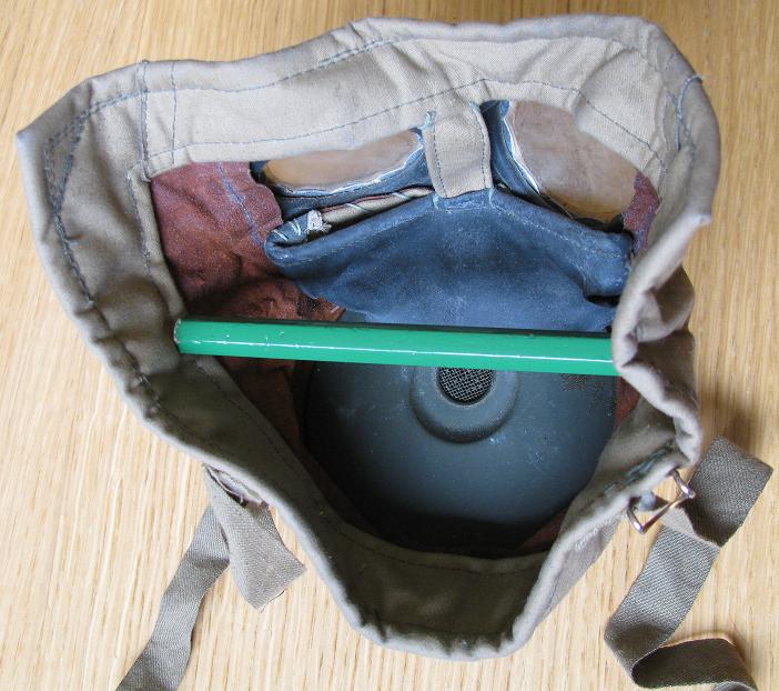Kas see võib olla näiteks kaitseliidus kasutatud gaasimaski jäänus? Metallosad on pronksist treitud, kokku annavad üsna arvestatava kaalu koonu otsa. Silmaklaasid on päris klaasist(ARS 41 tunduvad tsellofaanist olevat), Kandepael on kinnitatud veidralt ümber kurnastutsi, pealisriie nagu venivast trikookangast, all 3 mm punast kummi( tõenäoliselt kautšuki baasil). Number tundub olevat 18689.