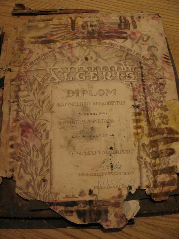Üks huvitavamaid pabereid on see Poola-Eesti võistluse diplom: Valgeristi III klassi diplom, nr. 86! KL diplomeid terve hunnik. Muuhulgas ka mõned tuletõrje tunnistuste jäänused... Nahast kaaned, millel peal KL kotkas.