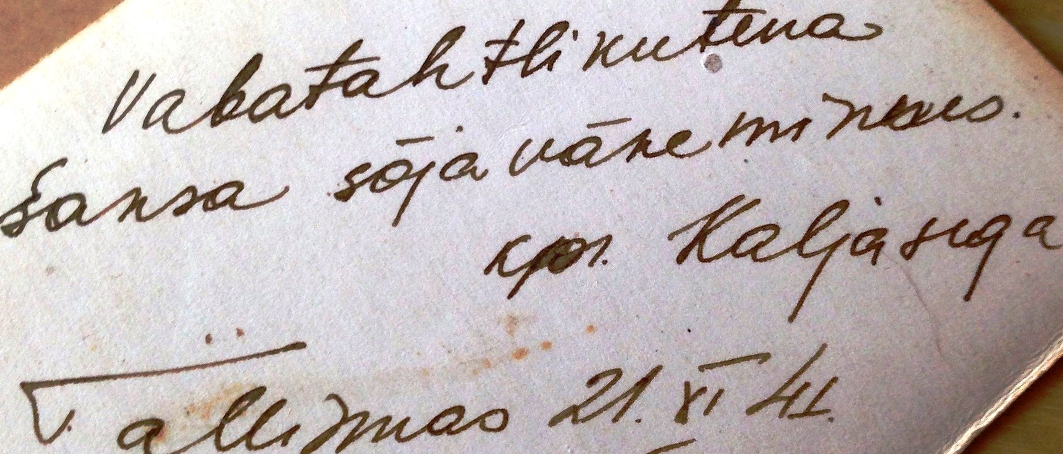 Olemaoleva foto taha on kirjuatud: vabatahtlikuna saksasõjaväkke minek koos kpr Kaljasega 21.11.1941 Tallinnas