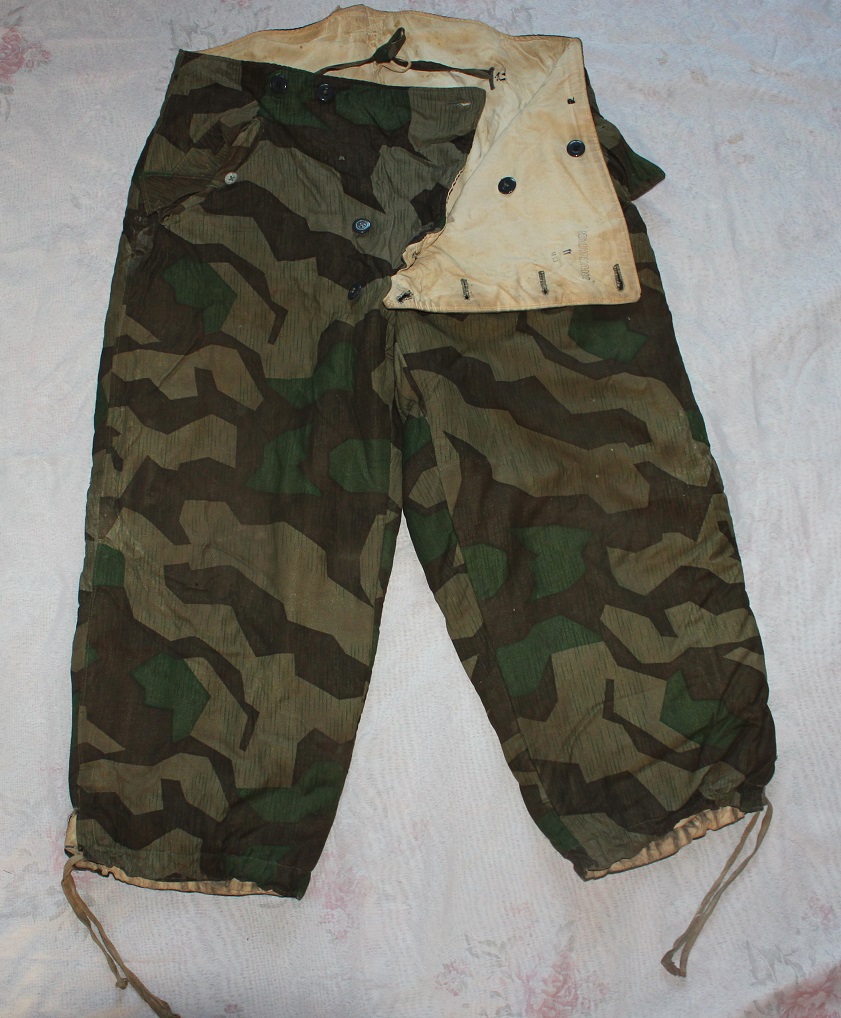 Sain sellise paari II MSi aegseid sooje talvepükse. Peal "Splittertarnmuster" ja seest valged; mõeldud mõlemat pidi kandmiseks (nööpide paigutus juba selline). Puudu on traksid, mis on ära lõigatud (vt fotot sellest kohast). Sees on säilinud nn pingutusvöö, et vastavalt oma laiusele pükse vöökohast koomale tõmmata. All säärtel olemas arvatavasti originaalpaelad. Sees olemas ka tempel RBNr.0/0769/0092. Lisaks löödud sisse "II" ja "M13". Pükste materjal väga tugev, nagu oleks poest ostetud paar aastat tagasi ja kasutatud tööpükstena (vt tagaküljel olevat paari cm plekki, vb mingi õli või vaik). Sees ühel valgel taskul on tasku sulgurkattelt üks nurk ära lõigatud (nööbikoht terve) ja ühel säärel on paari mm auk, kust sisse piiludes tundub, et sees on vatilaadne materjal. Puudu on ka üks nööp esiküljelt (alt kolmas).