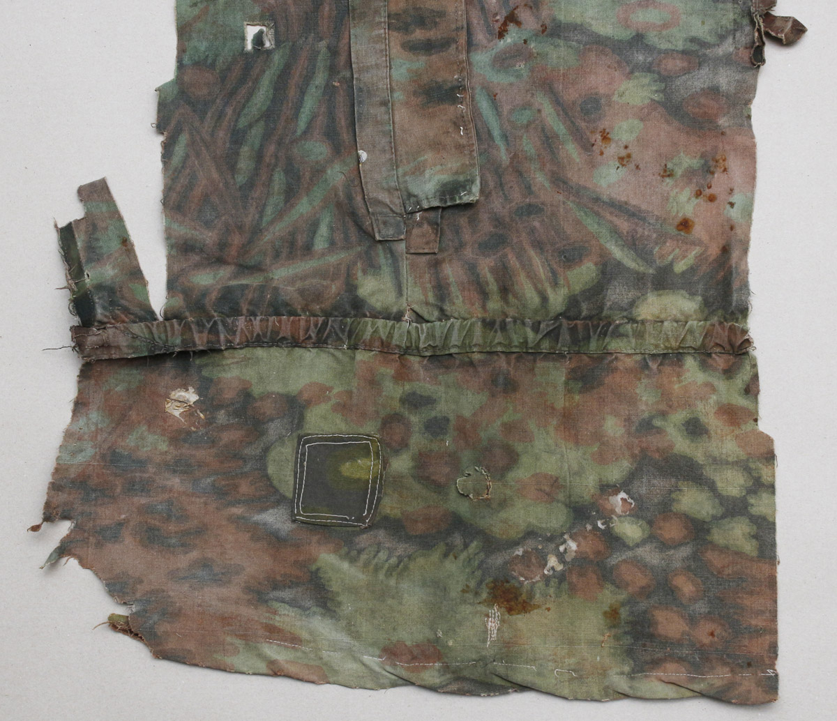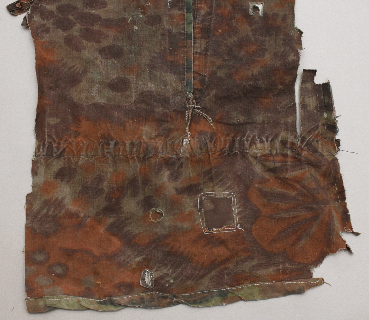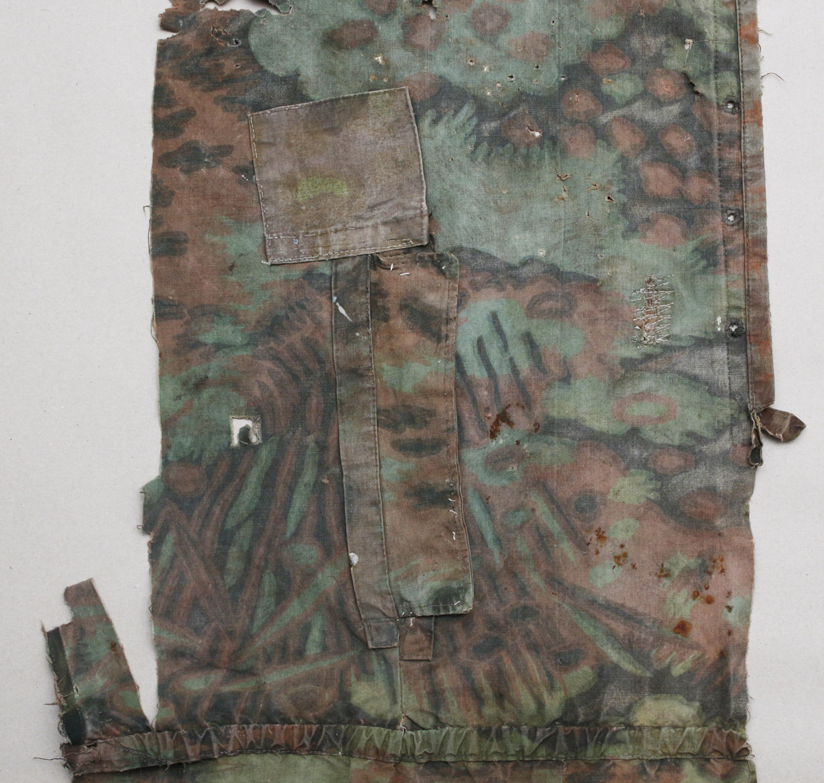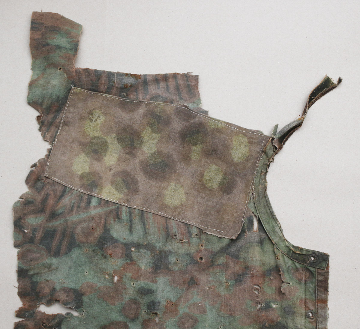 Natuke Palmimustriga maskeerimisjakki, kus on näha lausa viis sõjaaegset parandustööd.
