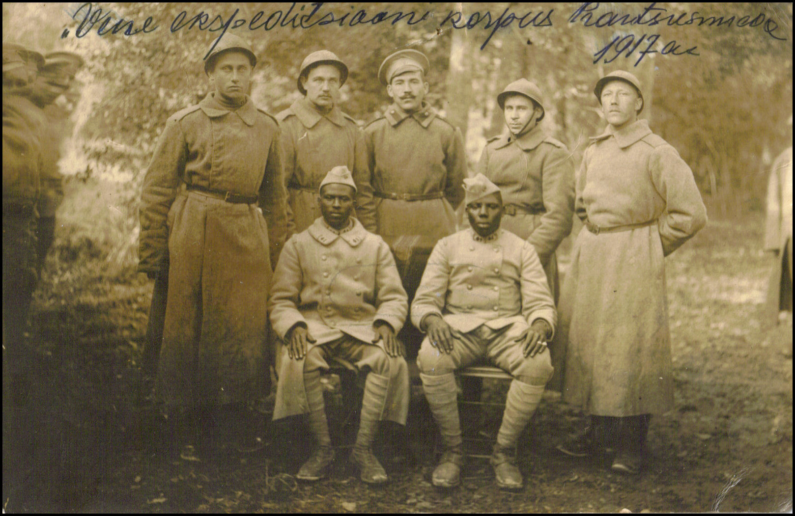 Istujad on minu sõbrad Senegalli neegrid ehk turkossid, kelledega terve suve sakslaste vastu võitlesime. Mõlemad on toredad poisid, räägivad prantsuse keelt, aga võitluses on nad liiga metsikud. Minule lähemal istuja nimi on Thiam Demba ja kaugemal istuja nimi on Ba Masane. - Elan toredasti. Olen lõuna Prantsusmaal puhkusel, kuhu kauemaks ajaks jään. Ootan Teilt kirjasid. Terviseid Teile mõlemale ja Corallule /?/