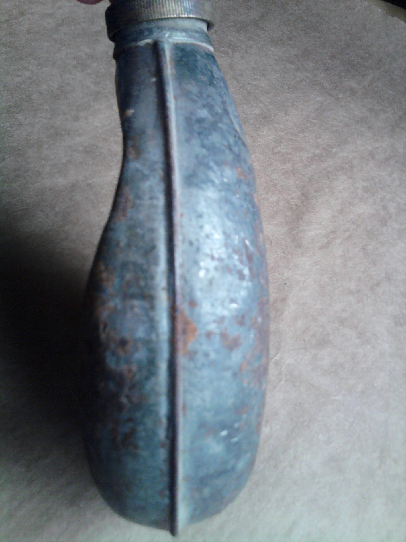 Sai siis hiljuti minu valdusesse selline plasku. Meenutab korpuselt kangesti tsaariarmee Железная фальцованная фляга тип A. Muidu on varasemad tsaariarmee pudelid justnimelt üheltpoolt lapikud ja teiseltpoolt kumerad, olgu raudplekk või alumiin. Model 1909 alumiinpudelid läksid läätseks, ehk mõlemalt poolt kumeraks alles. Ja kuju servavalts фальцованная mudeliga klapiks kui ka pinnatöötlus, kui ei tekiks suurt aga - tavalisel pudelil käis tavaline punn peale nagu igal teisel, siin aga peal keermega messingkork. Samas mõtisklesin, et tsaaripudelitel oli eri tootjaid ja esines nt kujuerinevusi pudelitel, küll mitte tohutuid erinevusi, aga siiski kujus tajub vahet. Sealt edasi hakkasin mõtlema, äkki esines siis ka punnides, aga et nii kardinaalne erinevus, see tundub jälle kuidagi ebaloogiline. Internetiavarused ei ole ka mind suutnud targemaks teha. Samkompunn ka ei tundu olema, kuidagi väga korralikult on tehtud. Korgi peal paistab olevat midagi olnud, tundub, et tinaga on hiljem parandatud/joodetud midagi seal, korgi sees korgipuidust tihend.