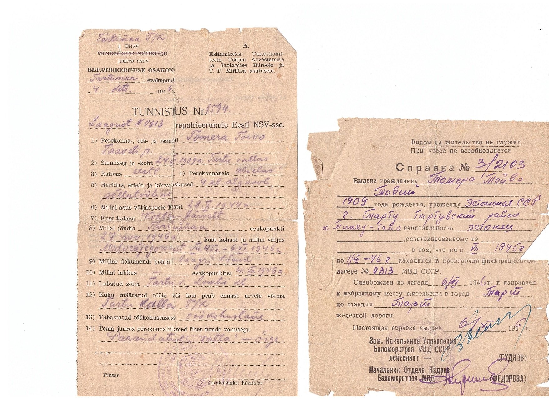 Tänan!uudishimulik kirjutas: ↑K Nov 20, 2019 6:45 pm Üleval ääres olev number 0313 näitab minu vanaisa vangitunnistuses kontrollfiltratsioonilaagrit Segeža Karjalas. Sinna läks Kohtla-Järve sõjavangilaagrist. Tunnistuse number on neljakohaline. Samuti tagasisõidu tunnistus neljakohaline. Järsku midagi sinnakanti?