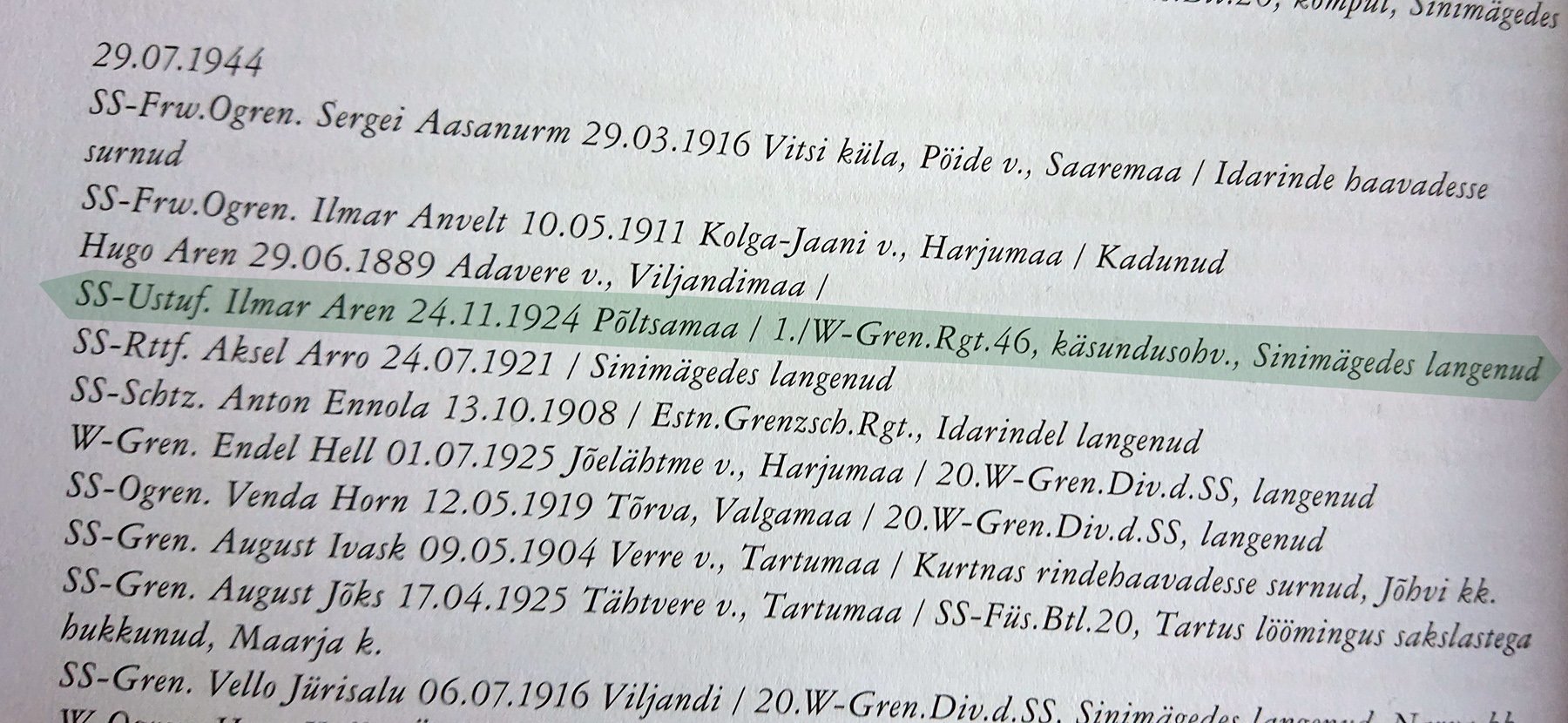 Is there anyone who can give more info on Ilmar Aren SS-Ustuf , born: 24.11.1924 in Pöltsamaa Gefallen: 29.7.1944 in Vaasa Served after finished SS-JS Tölz (44) in SS-Frw.Gr.Rgt.45.