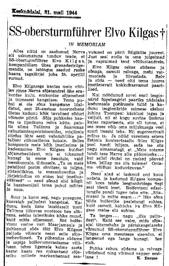 Otofotole muidugi täiendavad tänud uudse Kilgase pildi eest! Kilgas figureerib kindlasti veel ühel suhteliselt tuntud päevapildil ja kui mul nüüd õigesti meeles on, siis seal on ta tõesti koos austet Generalinspekteur'iga. Minu mäletamist mööda on mainitud ülesvõte ilmunud ka Rauno Võsaste Soodla raamatus (teos ei ole mul paraku hetkel käepärast) ja pärineb vist ühest leegionäride rindele (või väljaõppele) lähetamise pildiseeriastHeiki kirjutas:Minu andmetel on vasakult esimene Võhma ja kolmas Vaikmaa. Kes oskab kusagilt kontrollida, palun täpsustage.
