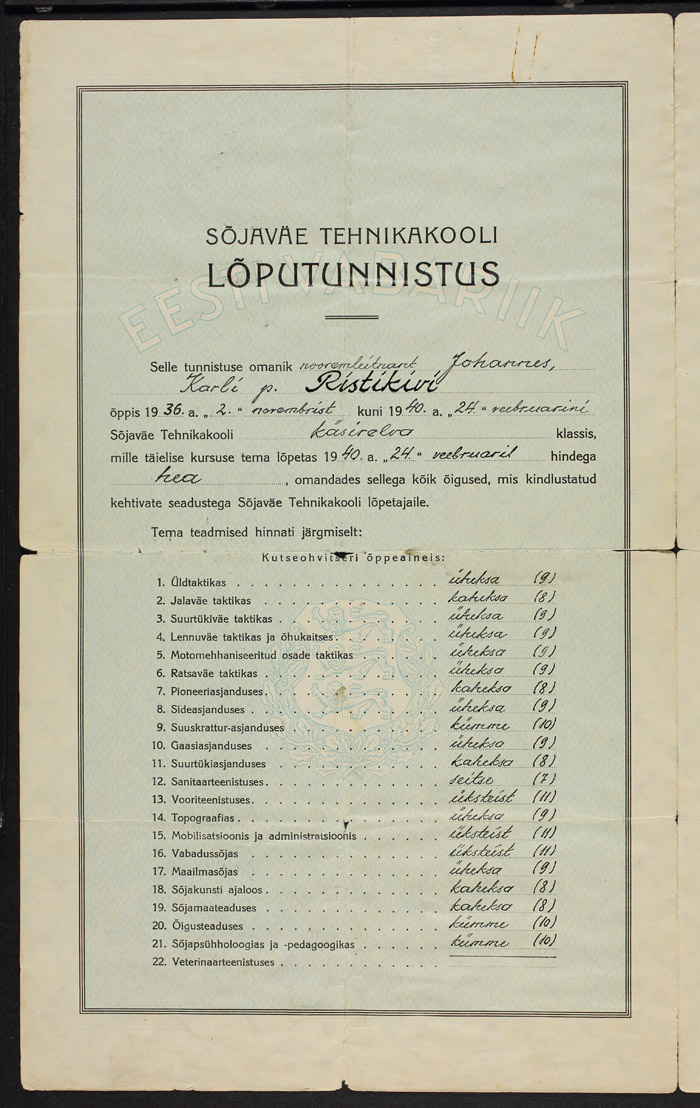 Allikas: "Eesti Vabariigi Sõjaväe Tehnikakool 1920-1923/1936-1940", Koostanud Andres Seene, 2006. a.