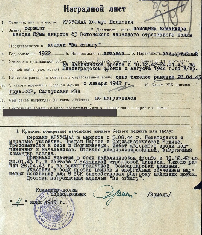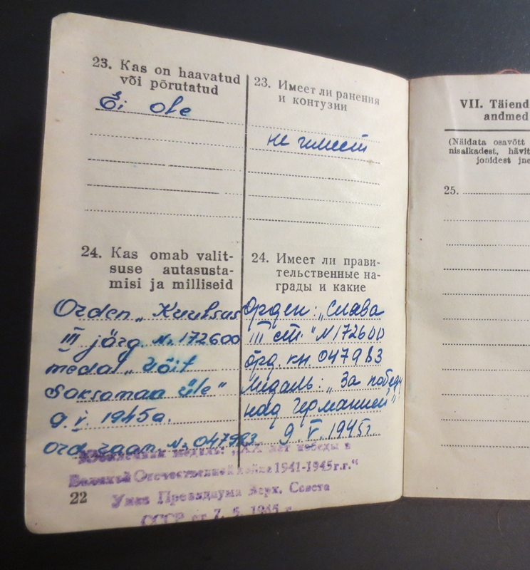 Sai üles korjatud Punatäht numbriga 1309156, mis on väga lähedane Käisi Punatähe ordenile (1309129). Olen üsna kindel, et 1309156 on samuti korpusega seotud.tossom kirjutas:Vanem Käis, 7. Laskurdiviisi 482. Üksiku luureroodu raadiojaama ülem. Punatähe ordeni ja lahinguteenete medali kavaler. Kahjuks saab hetkel näidata põhimõtteliselt ainult dokumente, loodame, et autasud ka päevavalgele ilmuvad.