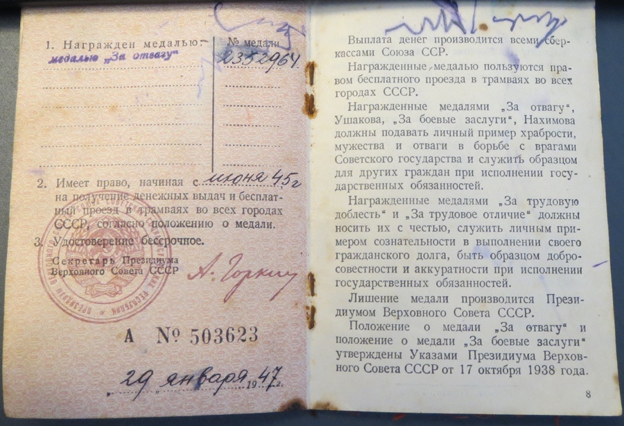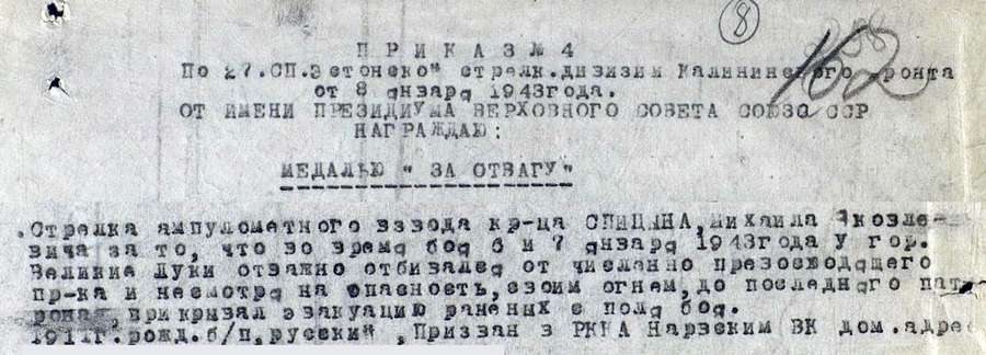 Kõvasti räsida saanud Vapruse medali sai 27. Laskurpolgu reamees Spitzyn Velikije- Luki all, kus 6.-7. Jaanuaril 1943 aitas lahinguväljalt haavatute evakueerimisele kaasa. Kattis oma automaaditulega viimase padrunini neid, kes haavatuid lahinguväljalt ära tõid.