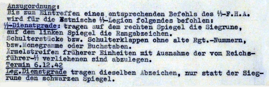 Leegionär Kurt Eiskop'i päeviku sissekanne 1943. aasta 18. oktoobrist: "Nüüd on ka kõigile Eesti Leegioni masinaile ja veokeile peale värvitud meie eri tunnus märk: käsi mõõgaga ja selle kohal E-täht. Samane märk, mis Vabadusristi keskel. Selle märgi pidime ka omale saama SS asemele. Ja vapp varrukale. Kunas see aga teostub, seda veel ei tea.".