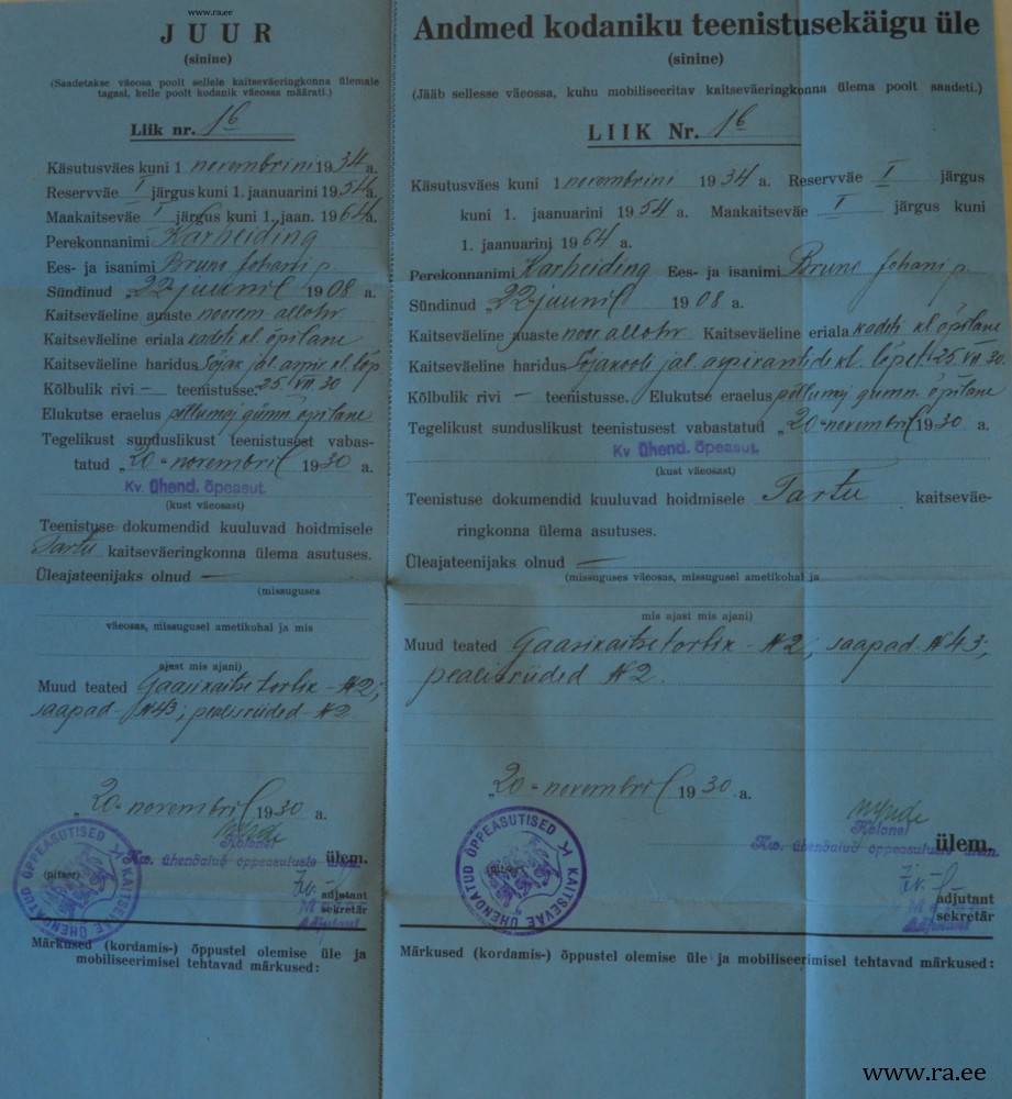 30. jaan. 1930. - Kuperjanovi üksikust jalaväepataljonist üle viidud teenistusse 7. jalaväe rügementi ja kantud rügemendi sõdurite nimekirjadesse.