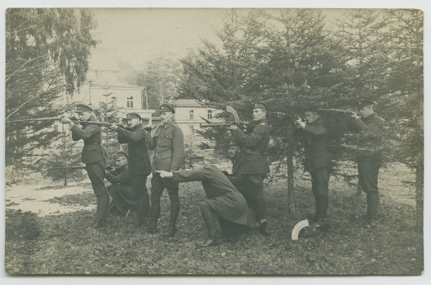 Sõdurite taustal paistab suur puithoone ning ilmselt on tegemist mõne mõisahoonega.