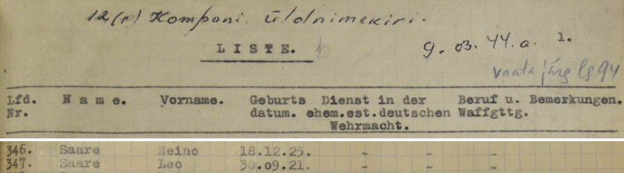 Teine dokument on 1944. aasta 9. märtsil koostatud 12. (raske) kompanii nimekiri. Sellelt paberilt saab ka välja lugeda, et kumbki vendadest ei ole varem Saksa sõjaväes teeninud ning Leo ei olnud läbinud ka ajateenistust Eesti sõjaväes.