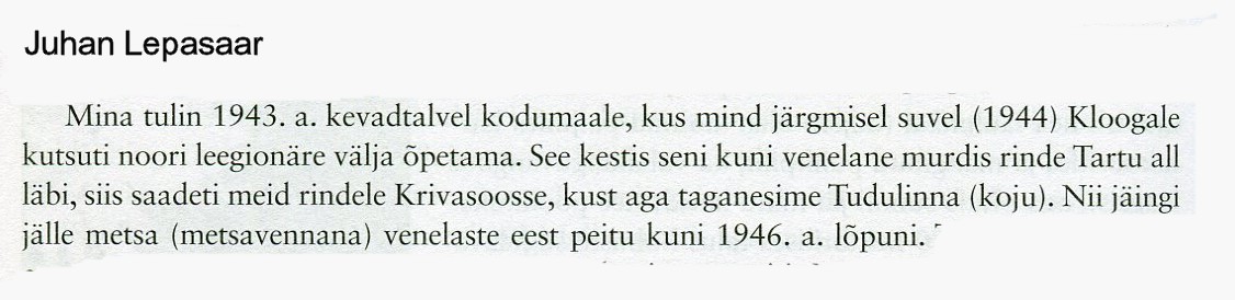 Klooga laagrisse toodi mingiks ajaks ka Soomest tulnud oh- vitseridekooli kadetid, kes moodustasid eraldi kompanii. Mõnel korral lasti neid meile jaoülematena õppusi läbi viima. On jäänud meelde nende rünnakujuhis, mis erines meie omast. Meile õpetati, et rünnakul tuleb hüpetega joosta kümme sammu, siis pikali viskuda, end kõrvale veeretada jne. Soomepoiss õpetas: ei tule püsti tõusta, vaid kätega end „üles tõugata”, nii et said viis kuni seitse sammu edasi minna, enne kui uuesti maha kukkusid. Ohvitserid (vänrikki’d) ega ka Eesti Vabariigi sõjakooli lõpetanud aspirandid ei tulnud arvesse. Umbes pooled neist olid rindekogemusteta ja määrati rügemendi staabi reservi. Saksamaal saadeti nad Bad Tölzi, kus nad pärast lõpetamist said Untersturmführer i auastme.