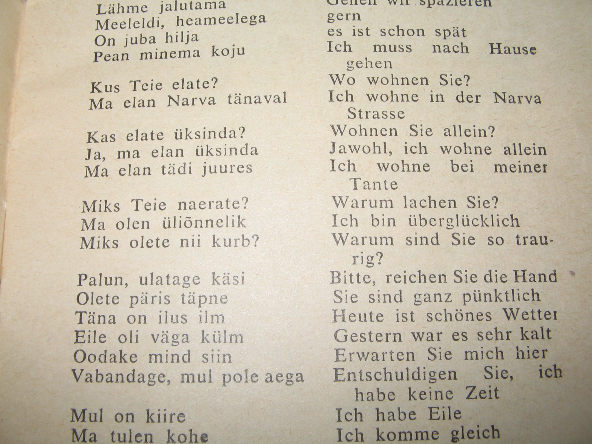 Kätte sattus Osvald Veetla kirjastuses 1941.a. Tartus välja antud trükis "Eesti - Saksa tõlk". Nagu väljaandja eessõnas märgib, siis: "Kuigi algaja esialgu puudulikult väljendab omi mõtteid ning soove, siiski osutub tal ikkagi end võõrkeelt valdajale arusaadavaks teha, ning see olekski peamiseks eesmärgiks, mida taotleb käesolev väiketõlk, pakkudes kaasabi selle sihi saavutamiseks."