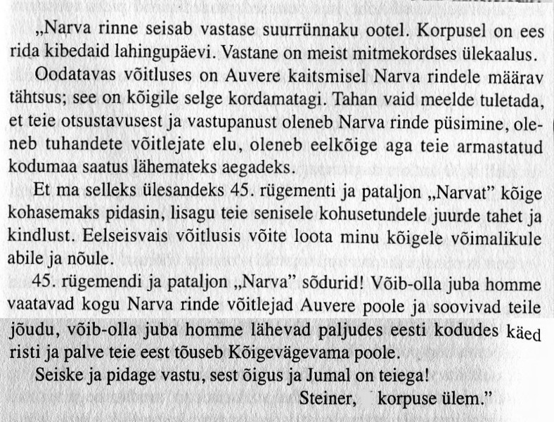 Mäletan, et sel ööl ma uinuda ei saanud - olukord oli liiga ärev. Mõtlesin meie kompanii poistele: “Kas nad suudavad vastu pidada?” Vastase poolel oli suur ülekaal nii elavjõu kui ka tankide osas. Kui major Riipalule alluvates üksustes oli umbes 2000, kõige rohkem 2500 meest, siis vastane võis meid rünnata mitme diviisiga. Oli ju Punaarmee rünnaku eesmärgiks Auvere juures rindest läbi murda, jõuda mereni Mummasaares ja armeegrupp “Narva” kotti võtta.