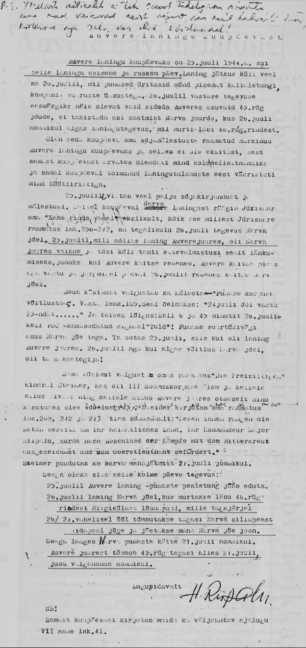 Sain seda läkitust lugeda 1/45 Rgt. lahingstaabis Maitla punkris kui mind sinna kutsuti uute ülesannete täitmiseks. Olen lähetatud 4. kp. juurde Joala ja Kopli rühma poistega Auvere tee kaitseks. Seda teed Auvere jaamani ei tohi lasta vaenlase valdusse. Kui nad siit tankidega läbi murravad, võivad nad 4 km eemal merelaheni välja jõuda ja riivistada kogu Narva rinde ja kotti ajada Narva jõel võitlevad diviisid.