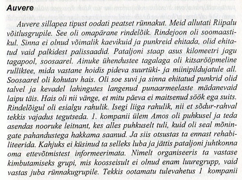 Sellist kohutavat heitlust elu ja surma vahel polnud keegi meist ennem näinud. Olime olnud lahingus nii palju kordi aga Auvere lahing pani krooni pähe neile kõigile. Hullumeelses rünnakus punalaviin hävis meie MG 42 marulises tules. Meie uduheitjad lõhestasid nende ridu. Kuulirahe... meie lõiku. Iga mees tulistas, kuulipildujarauad läksid kuumaks ning vahetades mehed põletasid näpud mida ei pandud isegi tähele. Püssirohusuitsu hõljus tagaplaanil nagu äikesevihma pilverüngas mattes särava päikesepaiste. Tahm, lämmatav tolm, suitsu vingusest puretud õhk kattis me ninasõõrmed pannes hingates läkastama. MG 42 kuulirahe... hävitavalt vaenlase ridades. Nad vajusid soomülkasse ja seal tulid T-34, umbes 30 tanki ründas meie teed. Joala pani esimesele tankile põntsu. Selle roomik lendas õhku ja tank keeras end ühel roomikul nagu koer katsudes leida oma saba. Tema teine ahjutoru kärakas tabas torni alust ja laskemoon plahvatas tornis, terve see kupatus lendas vastu taevast. Samal ajal olid ka Kanepi poisid tegutsemas seal pealetungivate tankidega. Kevvai purustas ühe tanki teel ja see pani seisma tee tagant tulevatele tankidele, ummistades tee. Üks tank katsus seda seisma jäänud tanki võtta sleppi või lükata teelt eemale, aga paki mehed panid põntsu sellele. Ka selle torn lendas vastu taevast. Paar lennukit, suitsuvine sabas, raksatasid flakitulest tabatult prantsatades metsatukka. Tankid ründasid Auvere teed. Auvere eel rünnakud tihenesid. Kella 10 ajal venelased murdsid läbi meist... oleval rindejoonel Narva pataljonist. Auvere pataljonistaabi juures käis kibe lahing. Kuuse poiss tuli staabist paludes meilt abi. Mõned kergemalt haavatud esimese abi punktist läksid temaga kaasa. Hullumeelne heitlus oli igal pool. Punaväge oli nii palju, et nad lihtsalt läksid meist läbi kadudes meie taha metsa. Meie poisid seisid oma aukudes, laskemoon hakkas otsa saama. Seda tassides paar meie meest... said pihta. Olukord muutus kriitiliseks. Väljalangemis... 24 mehest olid juba pooled välja langenud. Meil oli 8 meest surnud ja 4 haavatut. Kanepi jagu... venelaste rünnakul. Nad lihtsalt kadusid selle laviini alla. Meeleheitlikult Kevvai poisid ja Joala oma jaoga, vahetades stellungeid, karates august auku, laveerides ja tulistades hoidis maanteed vasakult poolt tule all. Asi hakkas pöörduma täbaraks kuna meist paremalt venelased möödusid Narva poistest, mahajäetud lõigust läbi. Joala seda nähes läks oma jaoga meist paremale ja avas kahest MG 42 tule venelastele selja tagant.