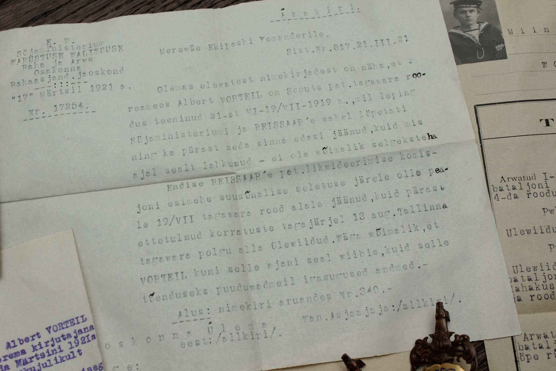 Vabadussõjast Scouts rügemendi ja Mereväe ekipaashi koosseisus osavõtnud noorem-allohvitser Albert Vorteil'i (peale eestistamist Virula) ja tema venna Jürg Nikolai Vorteil'i komplekt. A. Vorteil teenis Scouts rügemendis ümmarguselt 2 kuud ja rindele ei jõudnud, küll jõuti aga talle 1919. aasta suvel väljastada rügemendi rinnamärk, mis on tänaseni säilinud. Peale Vabadussõda teenis miiniristlejal "Vambola" noorema kirjutajana ja rahuajal sõitis kõvasti maailmameredel. Vend Jürg Nikolai teenis Esimese maailmasõja ja Vabadussõja ajal armees autojuhina ja rahuajal kuulus Kaitseliidu Tallinna malevasse. Alberti elutee lõppes sõdides Punaarmee ridades Saaremaal 1944. aasta oktoobris, Jürg Nikolai sai surma 1941. aasta 28. augustil oma kodumaja trepil kui läks vaatama, kas venelased on juba läinud ja sai õnnetul kombel mürsukilluga pihta.
