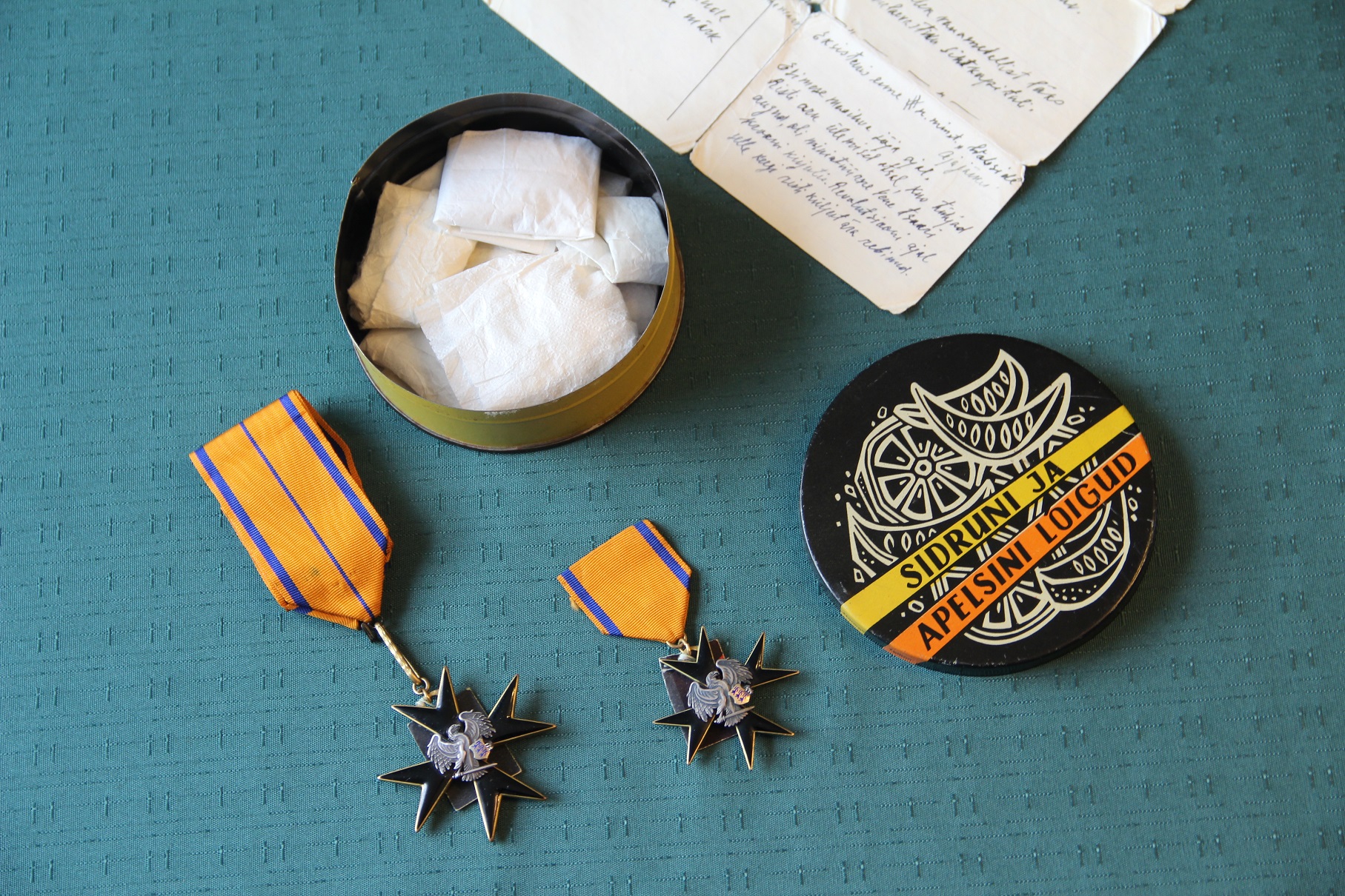 Esmalt hoiukohaks olnud karp koos sisuga. Kõikide märkide külge oli isand Avingo õmmelnud numbrilised sedelid, pakkinud märgid eraldi paberitesse ja omakäeliselt koostanud nummerdusele vastava nimekirja (loendi pildid postituse lõpus):
