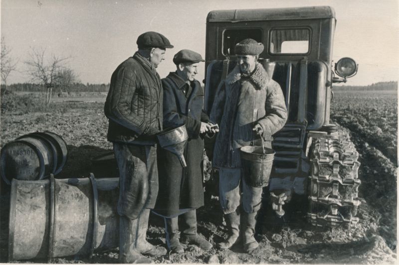 "Haapsalu raj. Risti traktorijaama teise traktoribrigaadi traktoristid R. Valk ja J. Tanner. 1953. Fotogr. J. Vatser. ETA." (muis.ee)