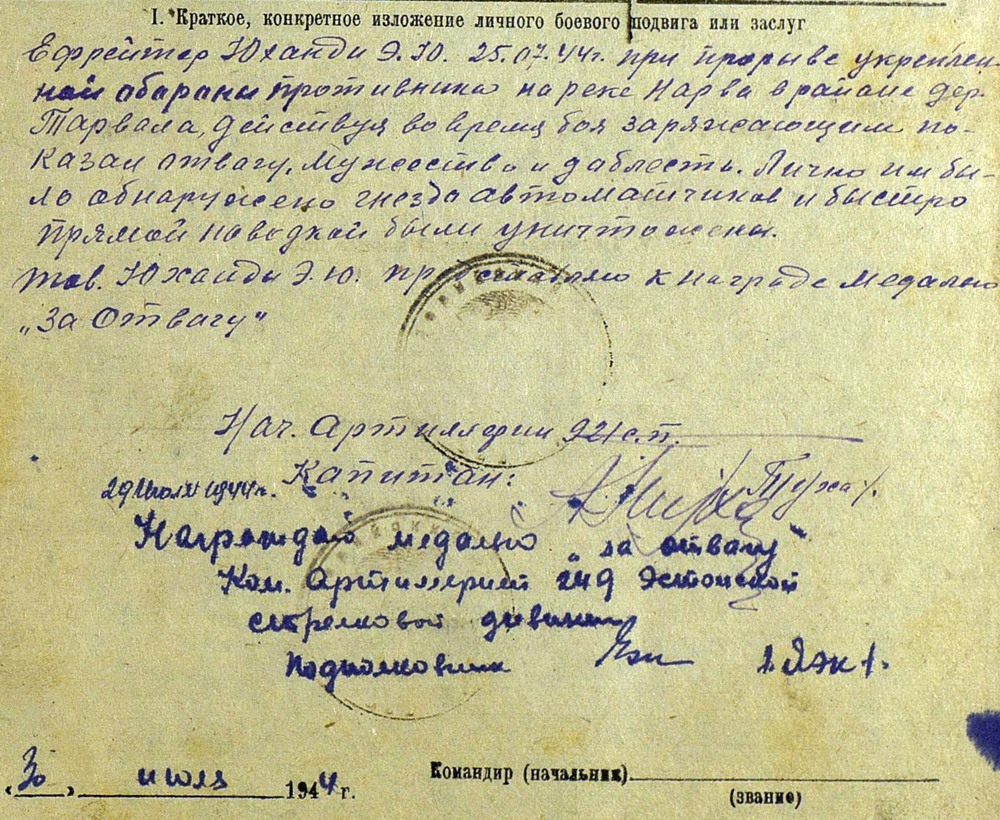 Medali dokumenti küll pole, kuid medal on tema oma. Oli koos juubeliordeni ja sõjast osavõtja tunnistusega.