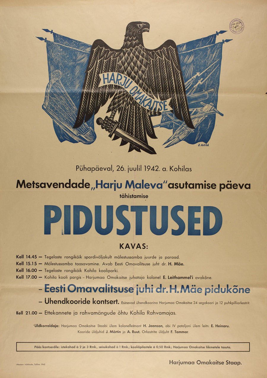 Metsavendade „Harju Maleva", millest võrsus hiljem Harjumaa Omakaitse, tähistab Kohilas tuleval pühapäeval oma asutamispäeva. Aastapäevapidustustest võtab osa Eesti Omavalitsuse juht dr. H. Mäe, esinedes peokõnega ja avades taas Vabadussõjas langenute Kohila mälestusmärgi. Pidustuste kontsertosa täidavad Harjumaa Omakaitse segakoorid 800 lauljaga ja 12 puhkpilliorkestrit 200 mängijaga.