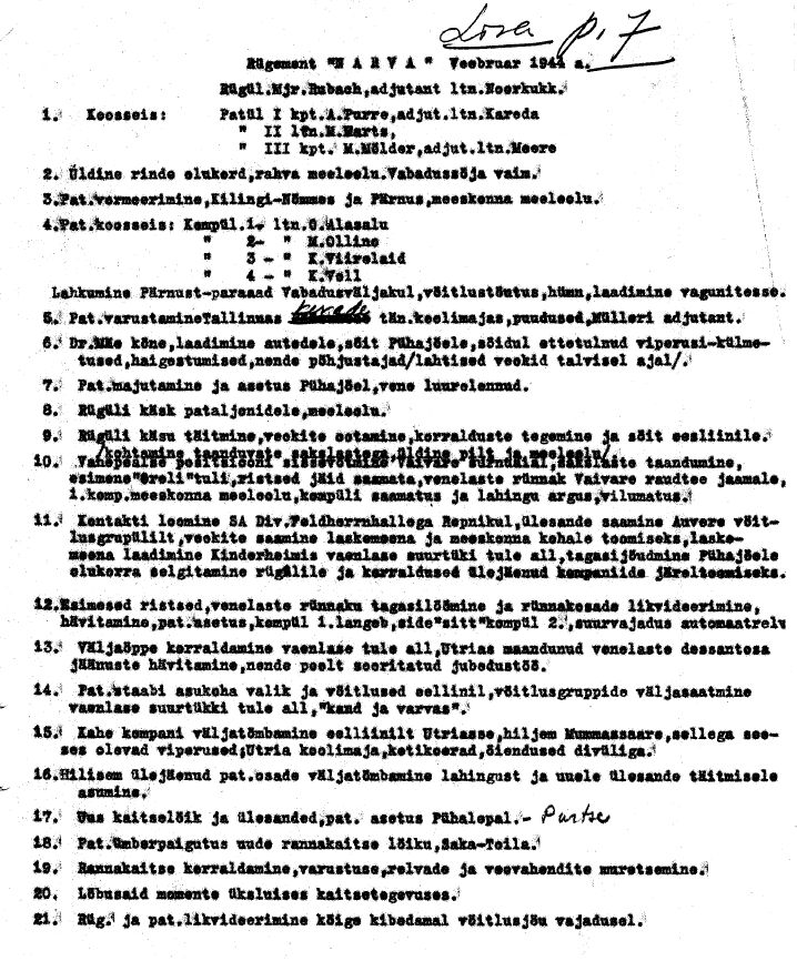 III/Reval ülema Mats Mölderi konspekt pataljoni tegevusest. Kuupäevad kahjuks puuduvad. Punktid 6-7 peaks olema 13. veebruar. Punkt 10 - 14. veebruar. Punkt 12 - 15. veebruar. Punkt 13 - 16. veebruar. Punktid 16-17 - 21.-22. veebruar.
