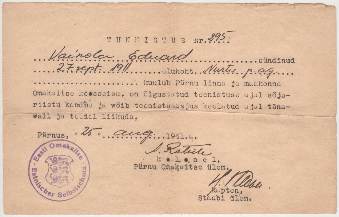 Kahju, et see Omakaitse paber endal leidmata jäi. Kuna sinna on trükitud muuhulgas " ... Pärnu linna ja maakonna Omakaitse ... " siis ei maksa vist loota, et see Sinu käest välja õnnestuks kaubelda?