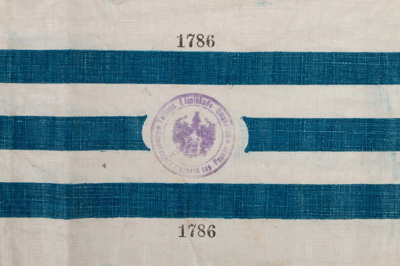 "Sideme keskosas, välimiste triipude üla- ja alaservas mustaga trükitud aastaarv 1786"