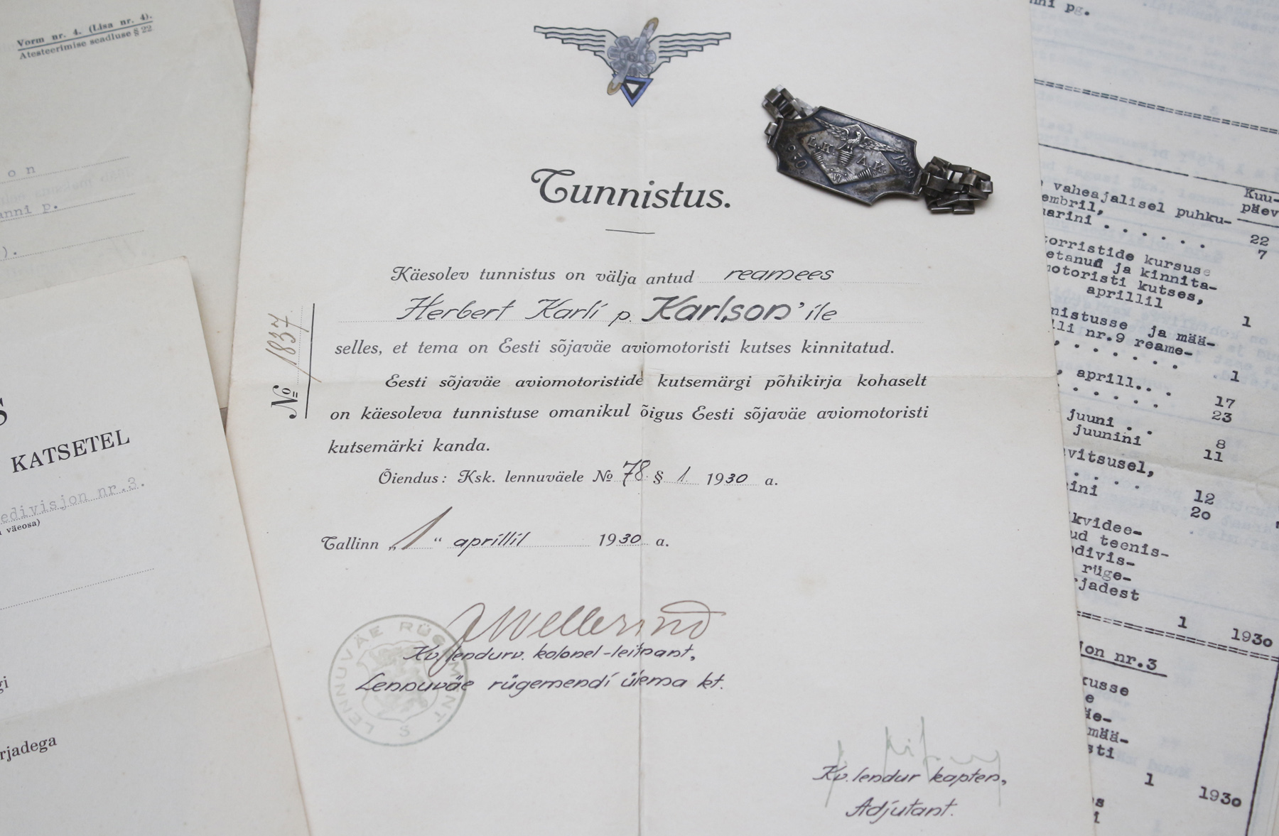 Eilne aviomotoristi komplekt - käeketil olevad tähed tähendavad Kaitseväe Lennukooli aviomotoristide VI lendu (1929 - 1930).