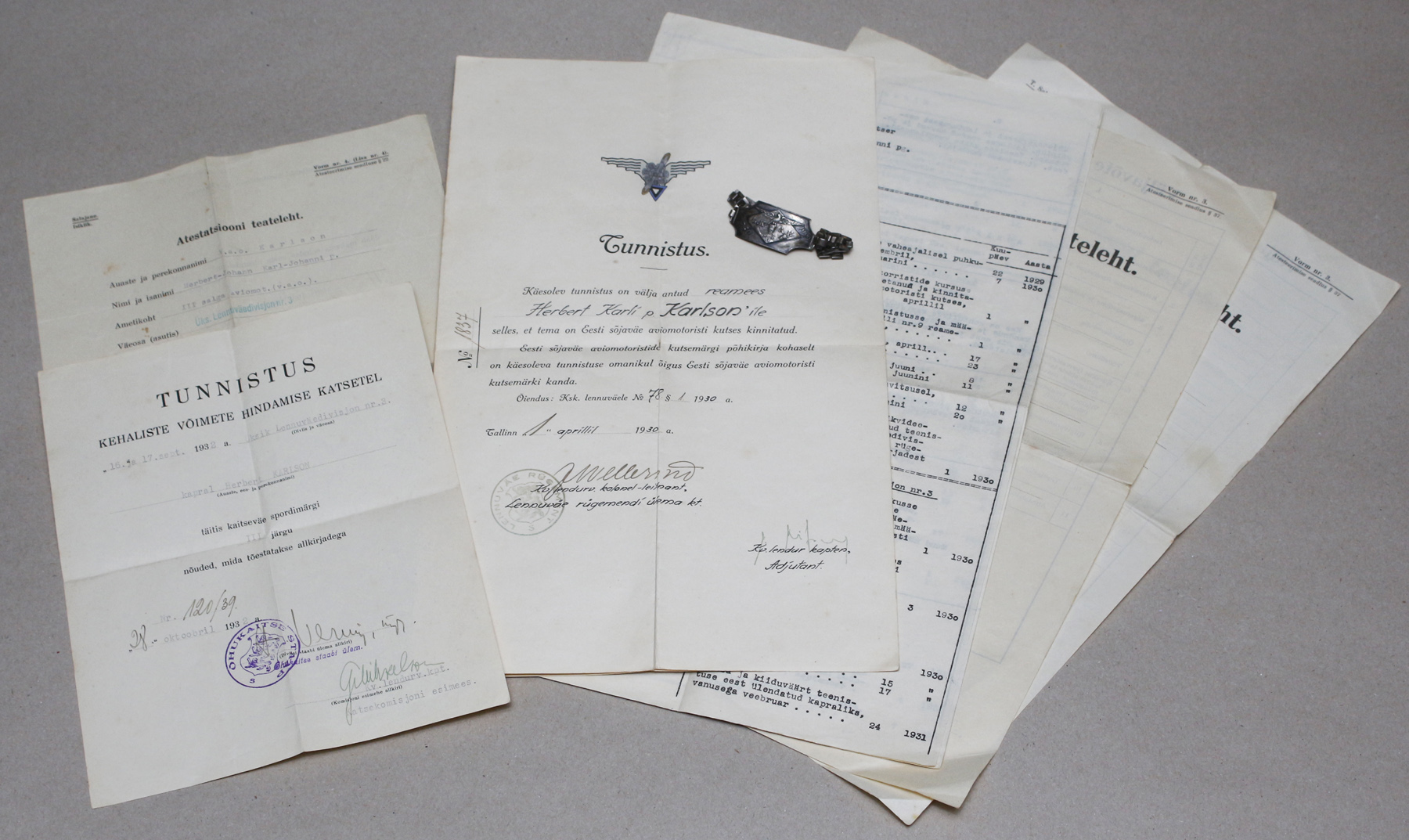 Kaitseliidu Saaremaa maleva rinnamärk kuulus Pöidest pärit Aleksei Truumets'ale (Truuvert), kelle elu lõppes 1948. aastal Venemaal vangilaagris. Vasakul olev märkmik, välkudega kraenurk, kotkas ja Dachau kilp olid Sturmgeschütz Abteilung 20 ridades teeninud Grenadier Ülo Käbin'i omad. Pildi keskel olev lõvidega kilp, märkmik, mansetinööbid ja vangilaagri toitlustuskaardid kuulusid Elmar Kanep'ile. Mees mobiliseeriti Punaarmeesse ja oli Tšerbakulis kui formeeriti Eesti laskurdiviise (sellest ajast on ka märkmik). Ilmselt Velikije Luki all jooksis üle, istus natuke aega vangilaagris ja teenis hiljem ühe Politseipataljoni ridades. Vabadussõja aegne Kalevlaste Maleva embleem, Vabadussõja mälestusmedal & 10. aastat Läti VS'ist kuulusid Karl Müller'ile. Päris Vabadussõja lõpus ülendati ta vanemallohvitserist ohvitseri asetäitjaks. Vasakus servas olev kolme lõviga kilp oli Valter Kivioja oma. EW mereväe auastmetunnused ja riviala eraldusmärk kuulusid Oskar Ferdinand Allik'ule, kelle teenistusaeg jäi 1930-ndate keskele. Paberkotiga jalaväerünnak, käisekilp ja kaks EW mütsimärki kuulusid hilisemale Hauptstufmührer Theodor Liht'ile. Käisekilp on eeldatavalt ajast kui ta teenis Rebase pataljonis kompaniiülemana.
