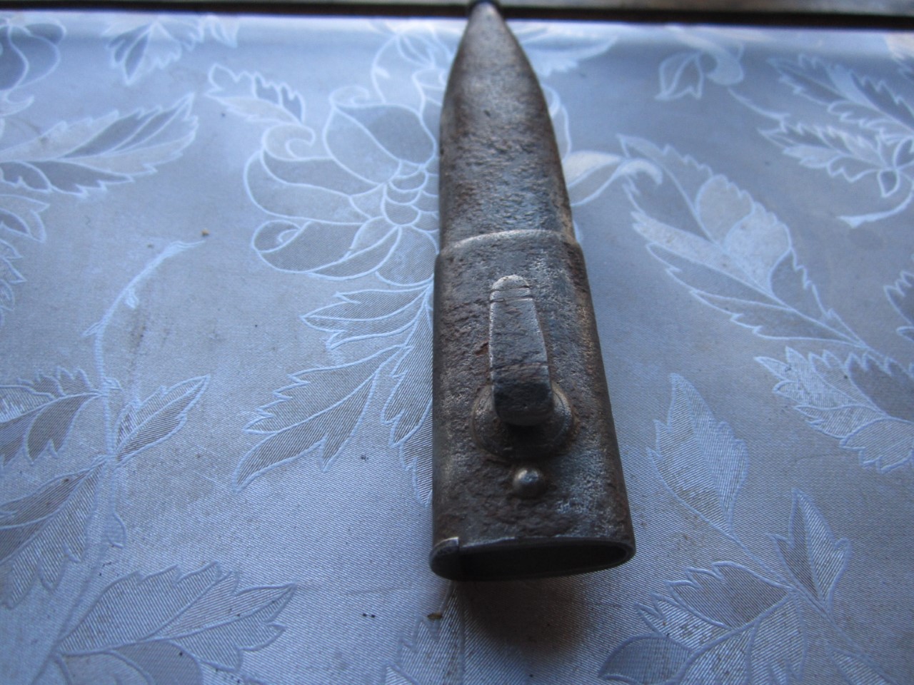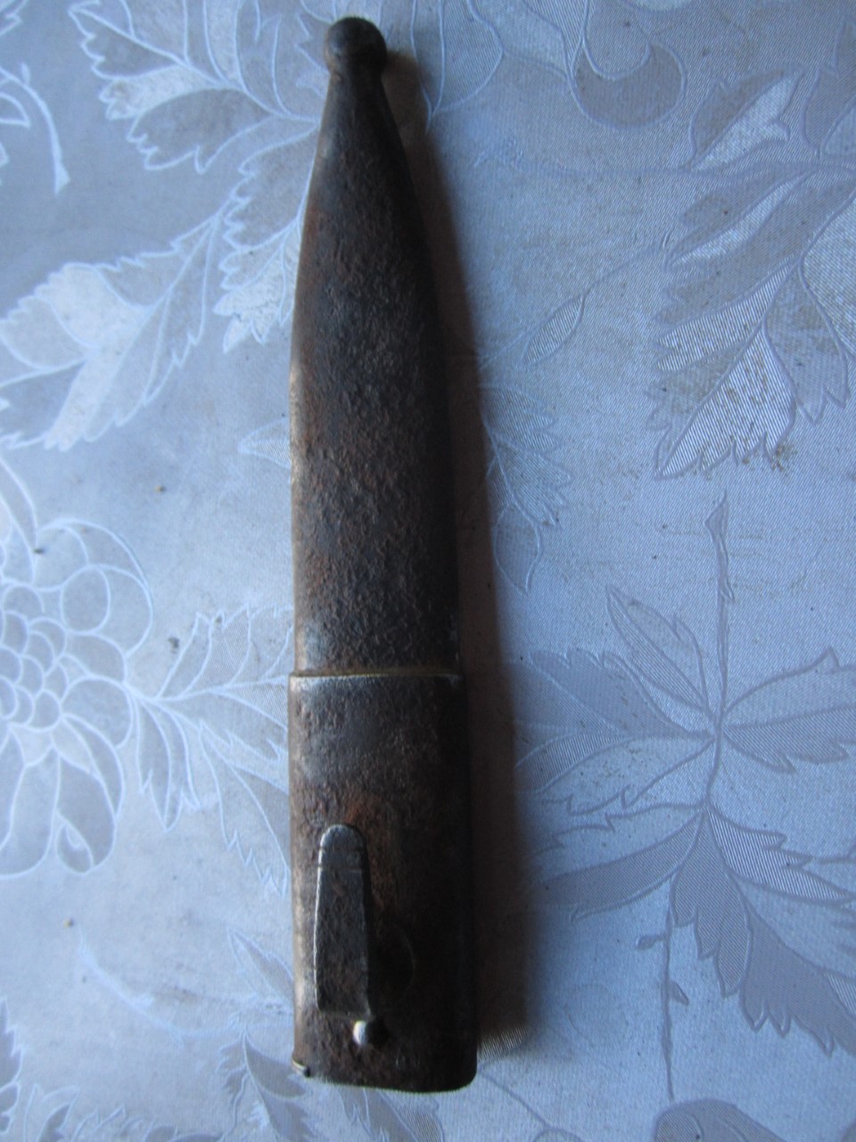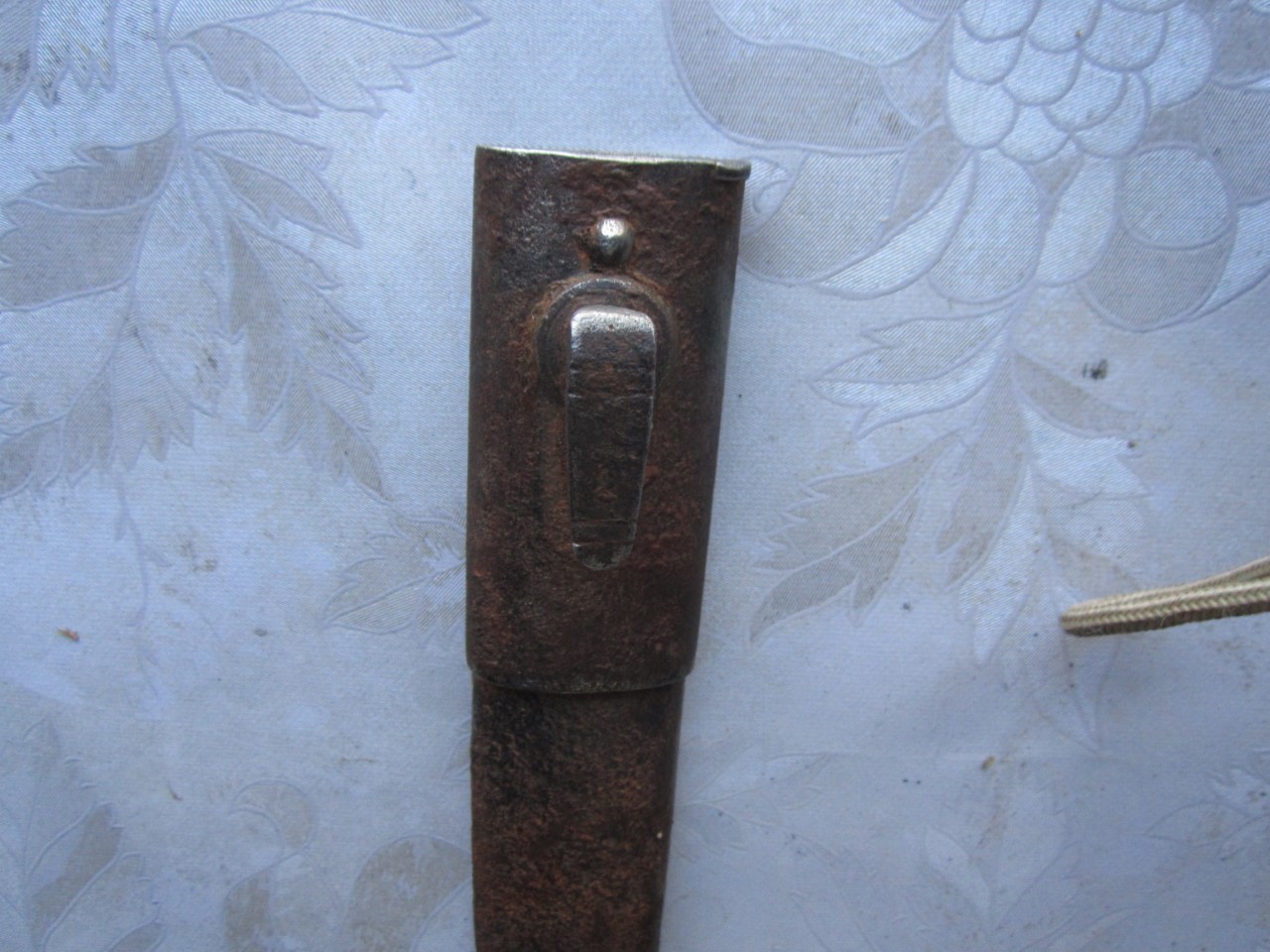 Mosina täägitupe uhkem versioon, ehk siis 1936 ratsaväeväitsa NKVD versioon (?), mille tupel on 3 järjestikust aasa, kuhu kinnitada mossina tääk. Mis arvate, kas jätan nii nagu on (lasen sellisel kujul ära konserveerida)? või teeks uue tupe ning ajaks vaskosad läikima, et väliselt seinal vähemalt ilus välja näeks? Tera puhul midagi väga päästa pole, hape või lüüs sööks selle päris ära.... Praegu istub vees, vastasel juhul jääks käepideme puidust ilma.
