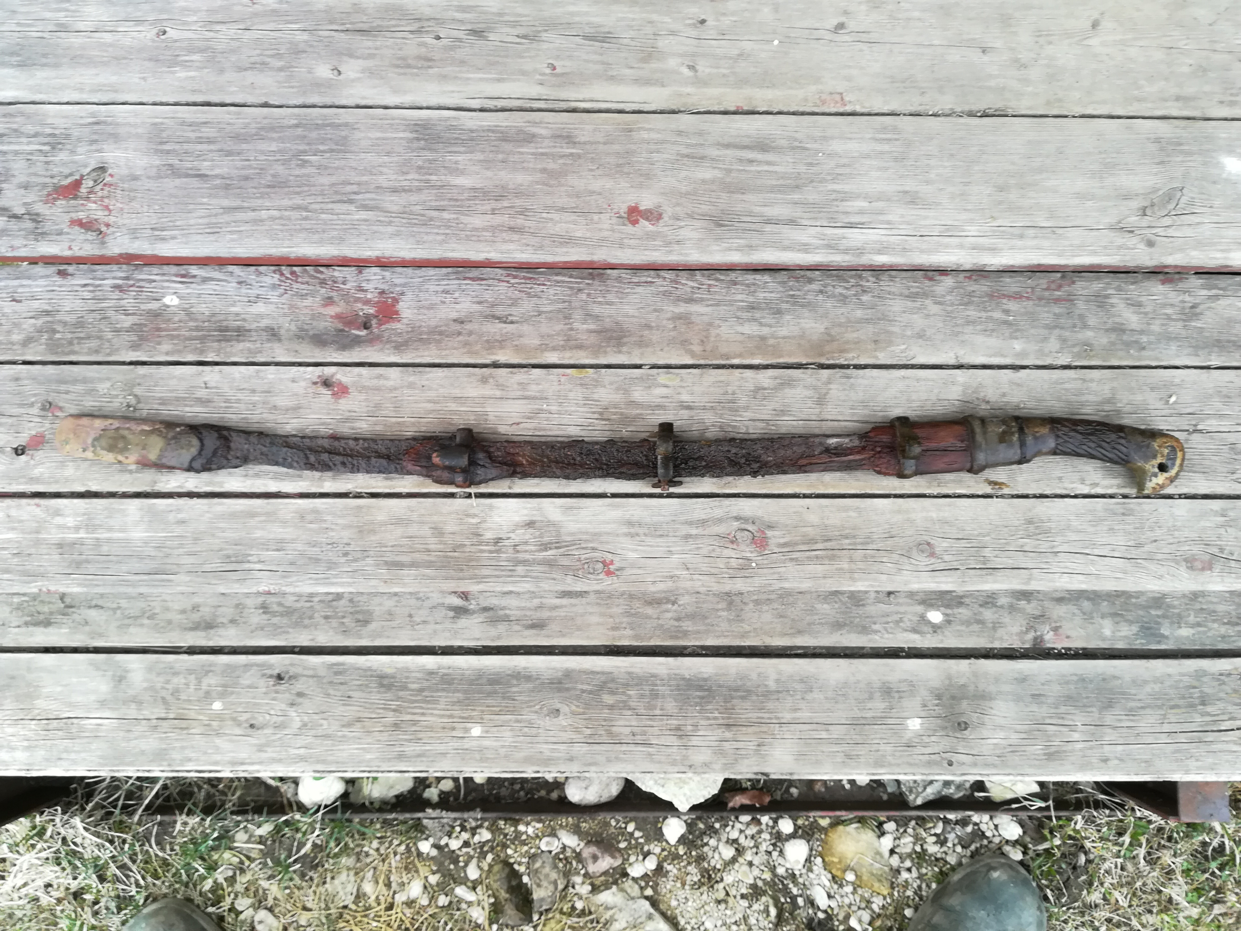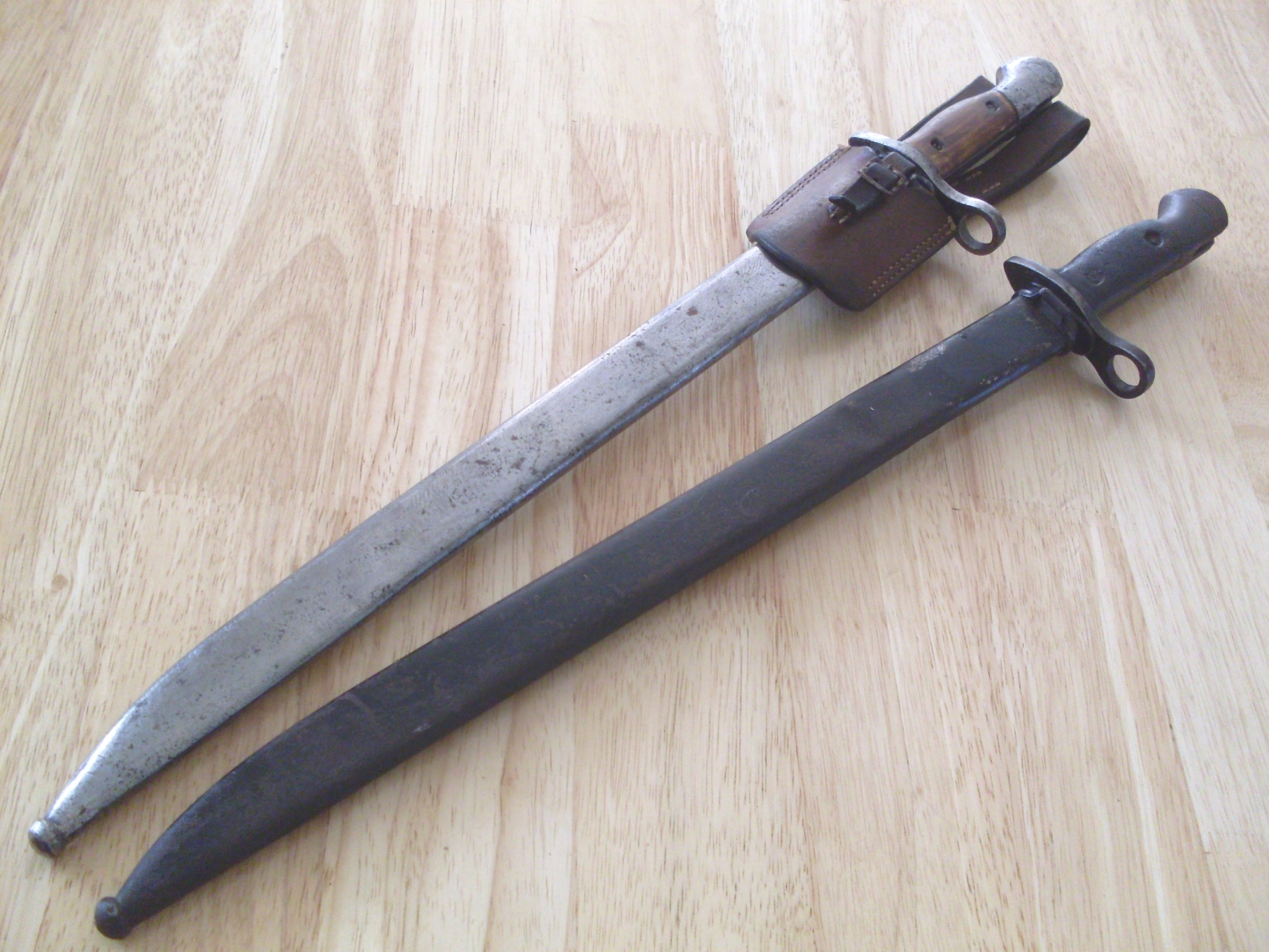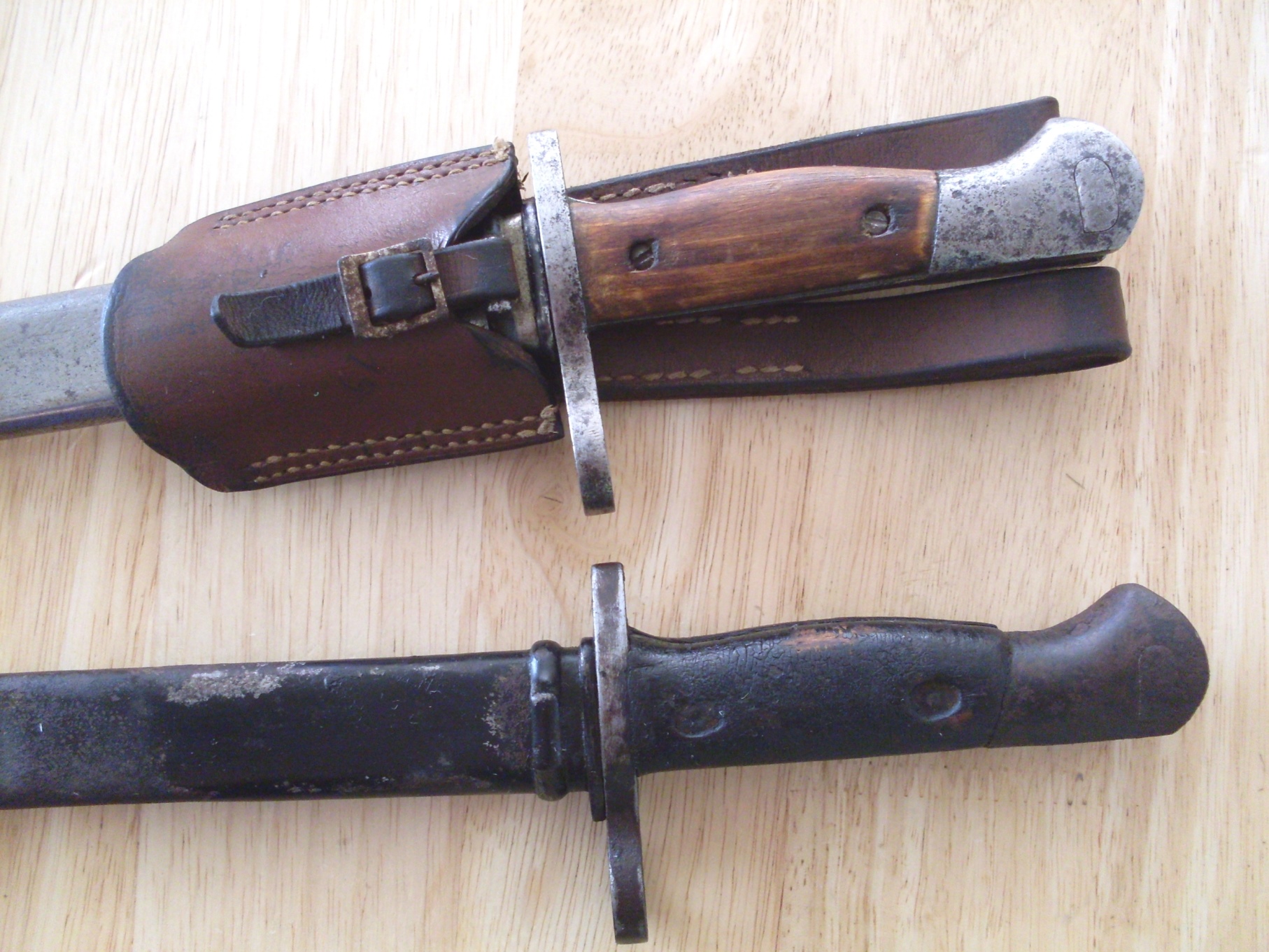 Mosina täägitupe uhkem versioon, ehk siis 1936 ratsaväeväitsa NKVD versioon (?), mille tupel on 3 järjestikust aasa, kuhu kinnitada mossina tääk. Mis arvate, kas jätan nii nagu on (lasen sellisel kujul ära konserveerida)? või teeks uue tupe ning ajaks vaskosad läikima, et väliselt seinal vähemalt ilus välja näeks? Tera puhul midagi väga päästa pole, hape või lüüs sööks selle päris ära.... Praegu istub vees, vastasel juhul jääks käepideme puidust ilma.